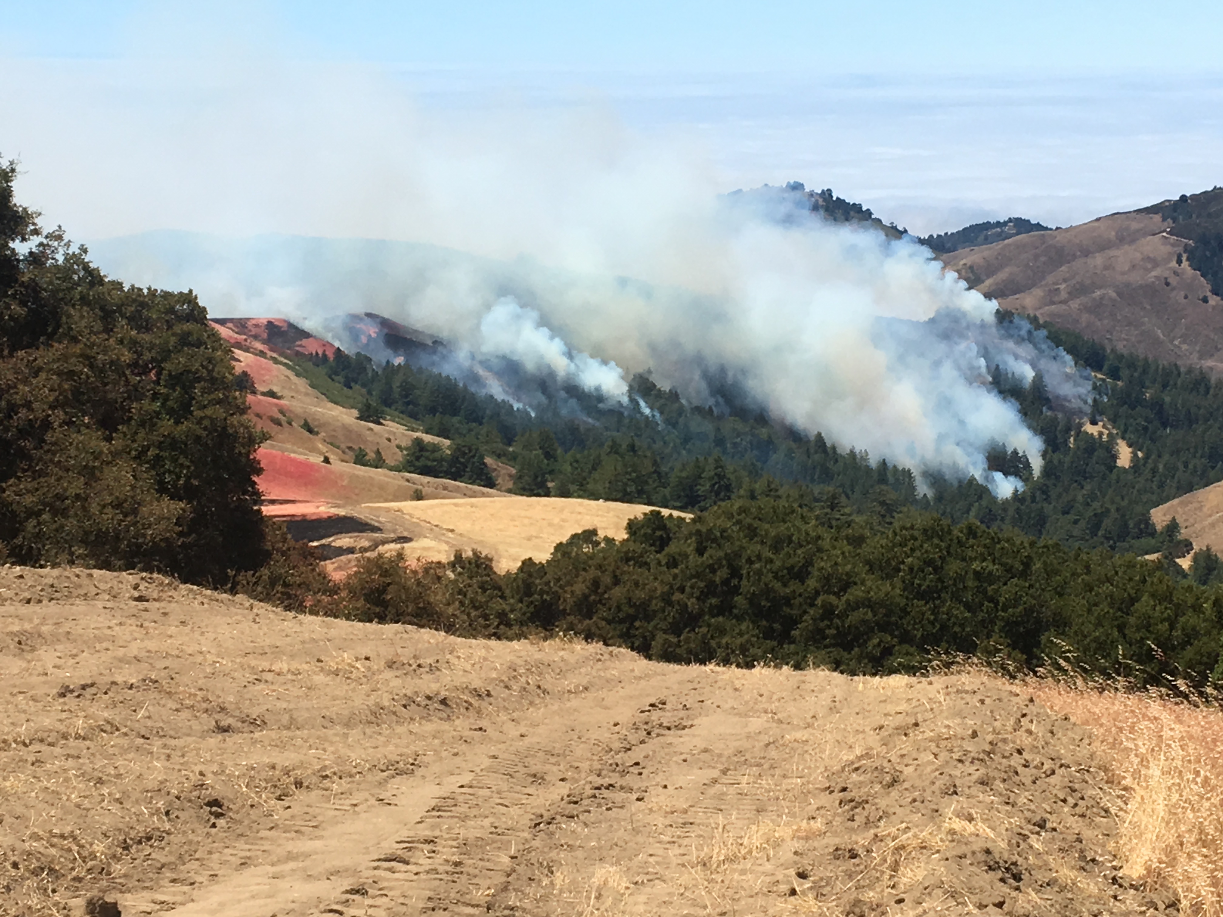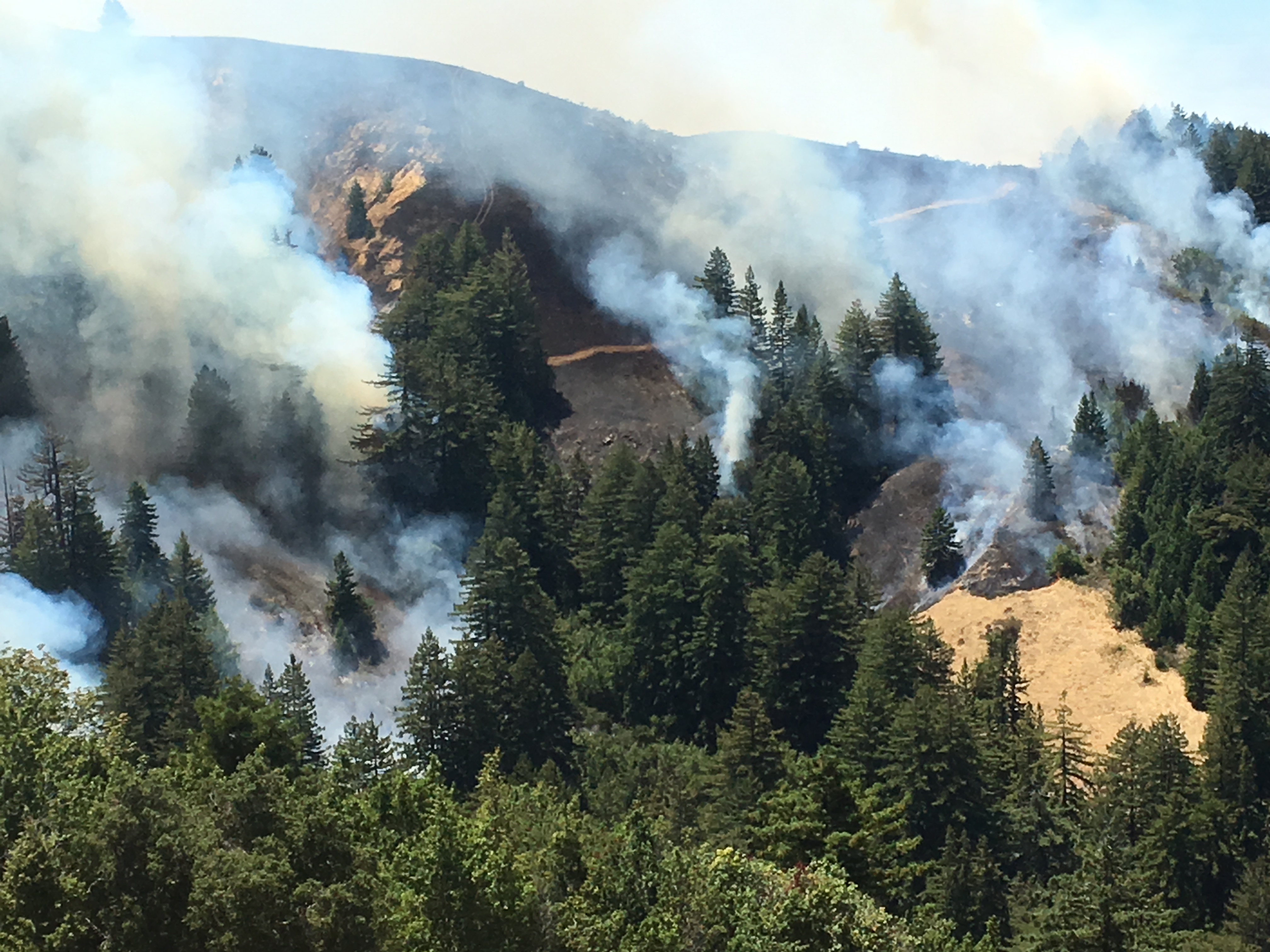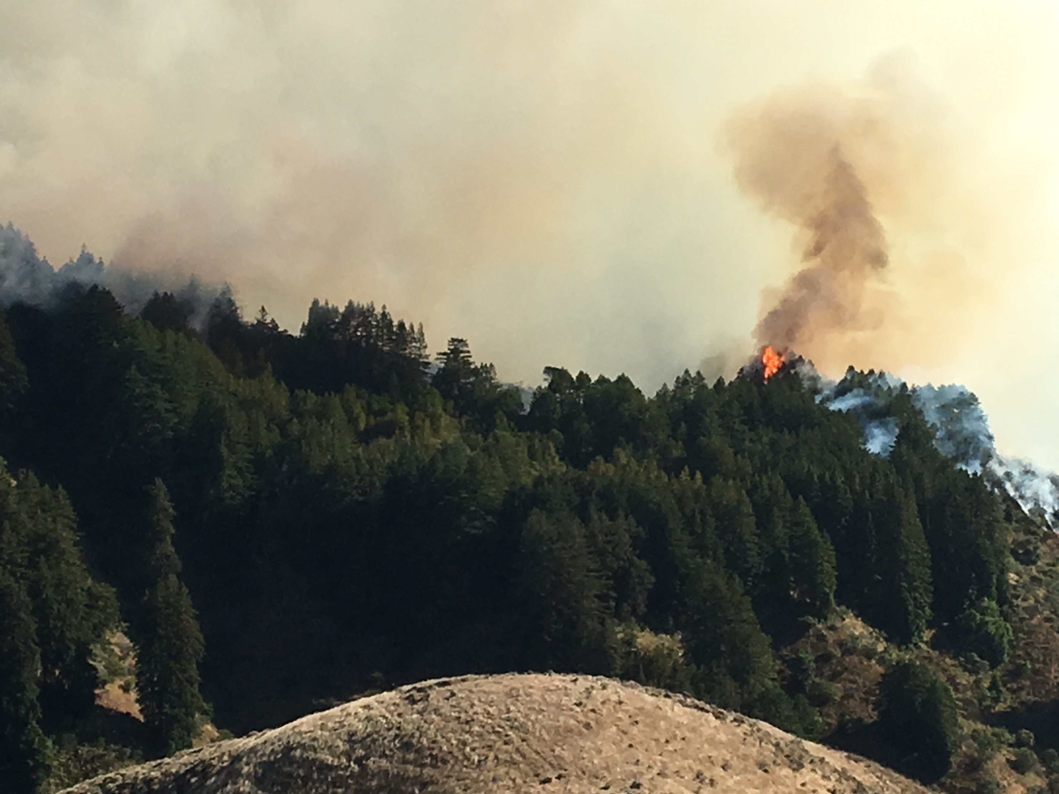 1:00 pm: Fire backing into the redwood forests in the upper Mal Paso Creek watershed.