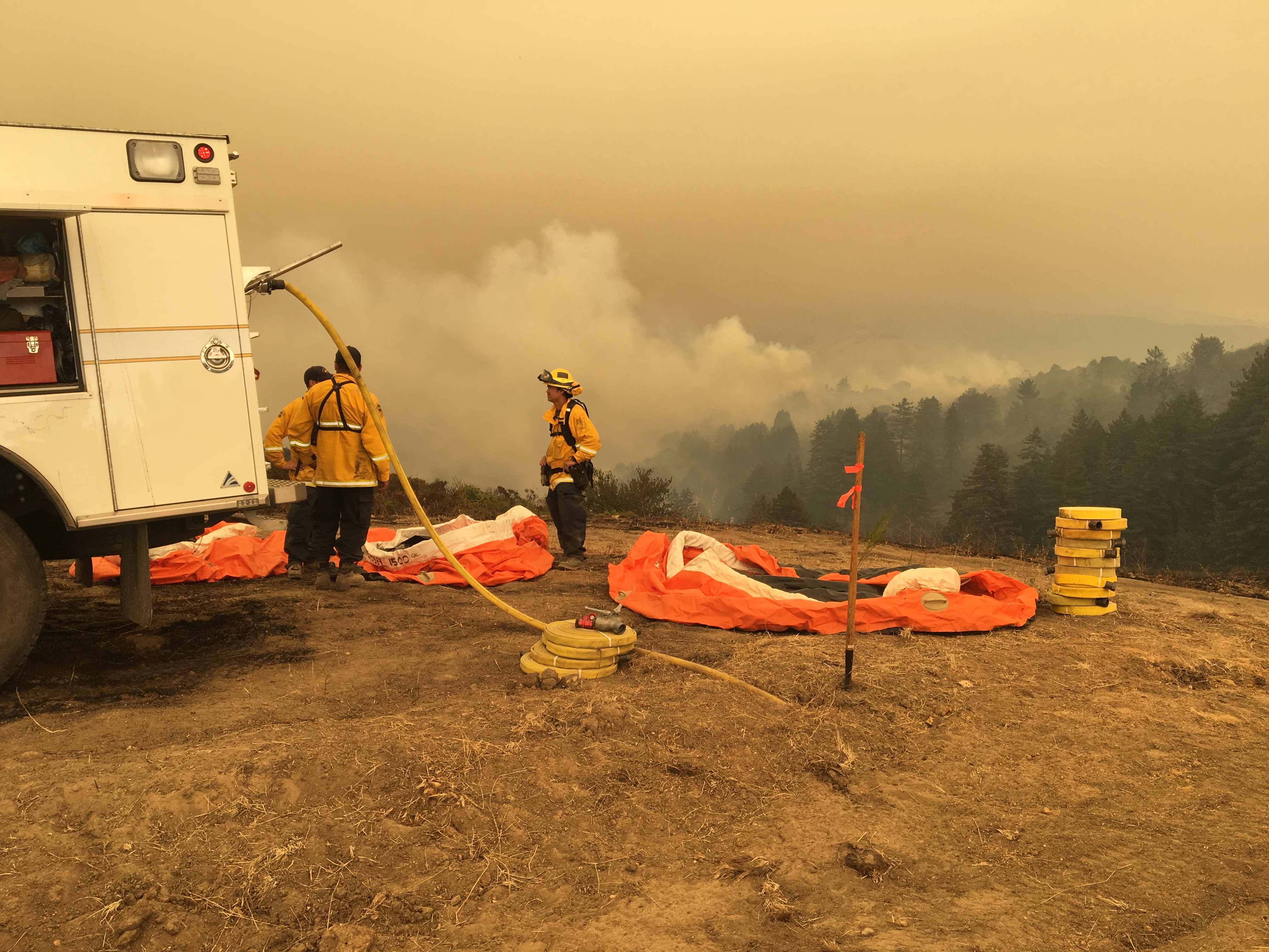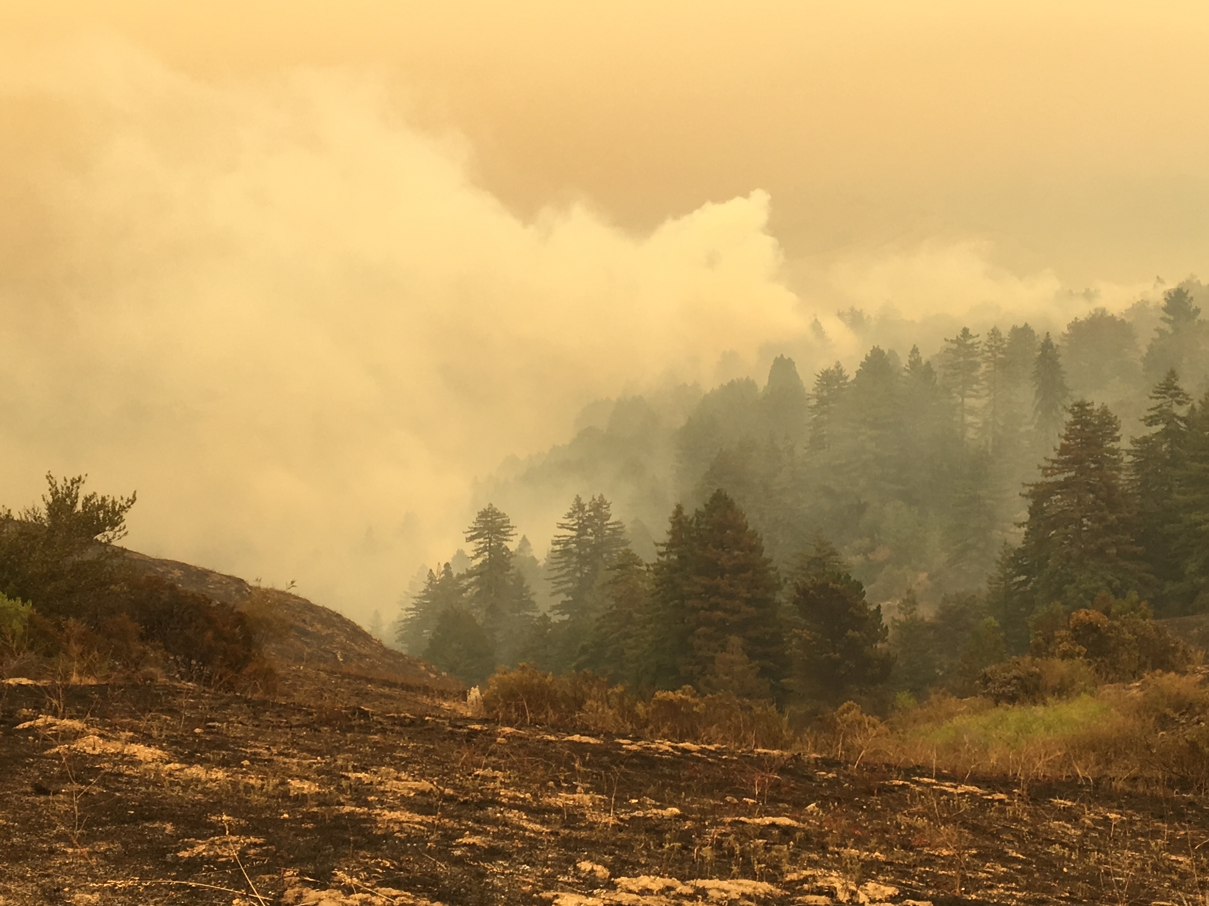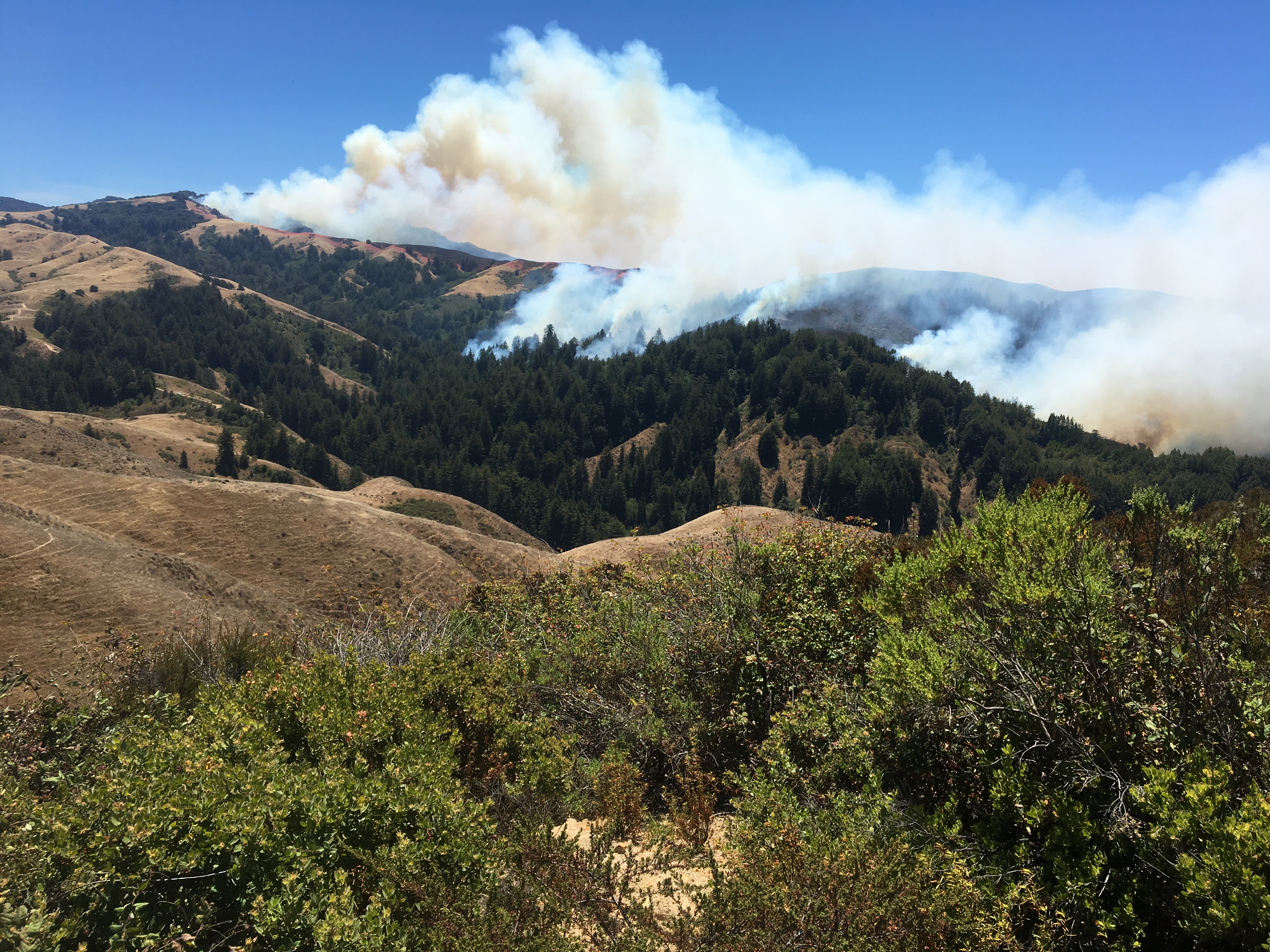 1:00 pm: Fire backing into the redwood forests in the upper Mal Paso Creek watershed.