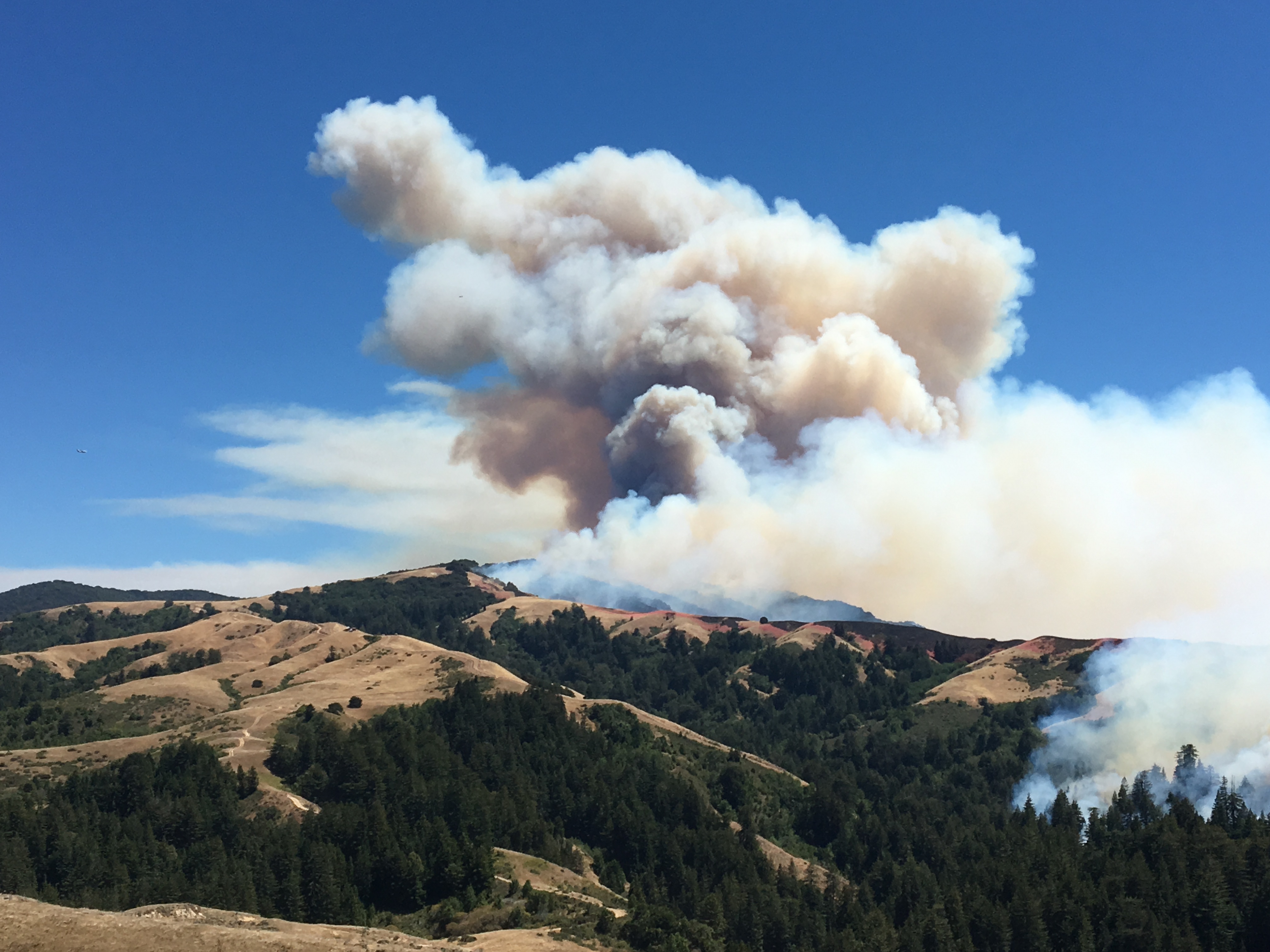 Hikers on the extremely popular Soberanes Loop Trail in Garrapata State Park spotted the Soberanes Fire smoldering in a forested draw further up the canyon sometime around 8:00 or 9:00 this morning. The fire spent most of the day burning in the upper Soberanes Creek watershed, reaching (and being stopped at) the ridge, as clearly seen in this photo, between Soberanes and Mal Paso Canyons, and burning along the lower slopes of Palo Corona (left and upper left of the photo). It did not reach any part of the popular trail. By early evening, the fire had burned around 300 acres.