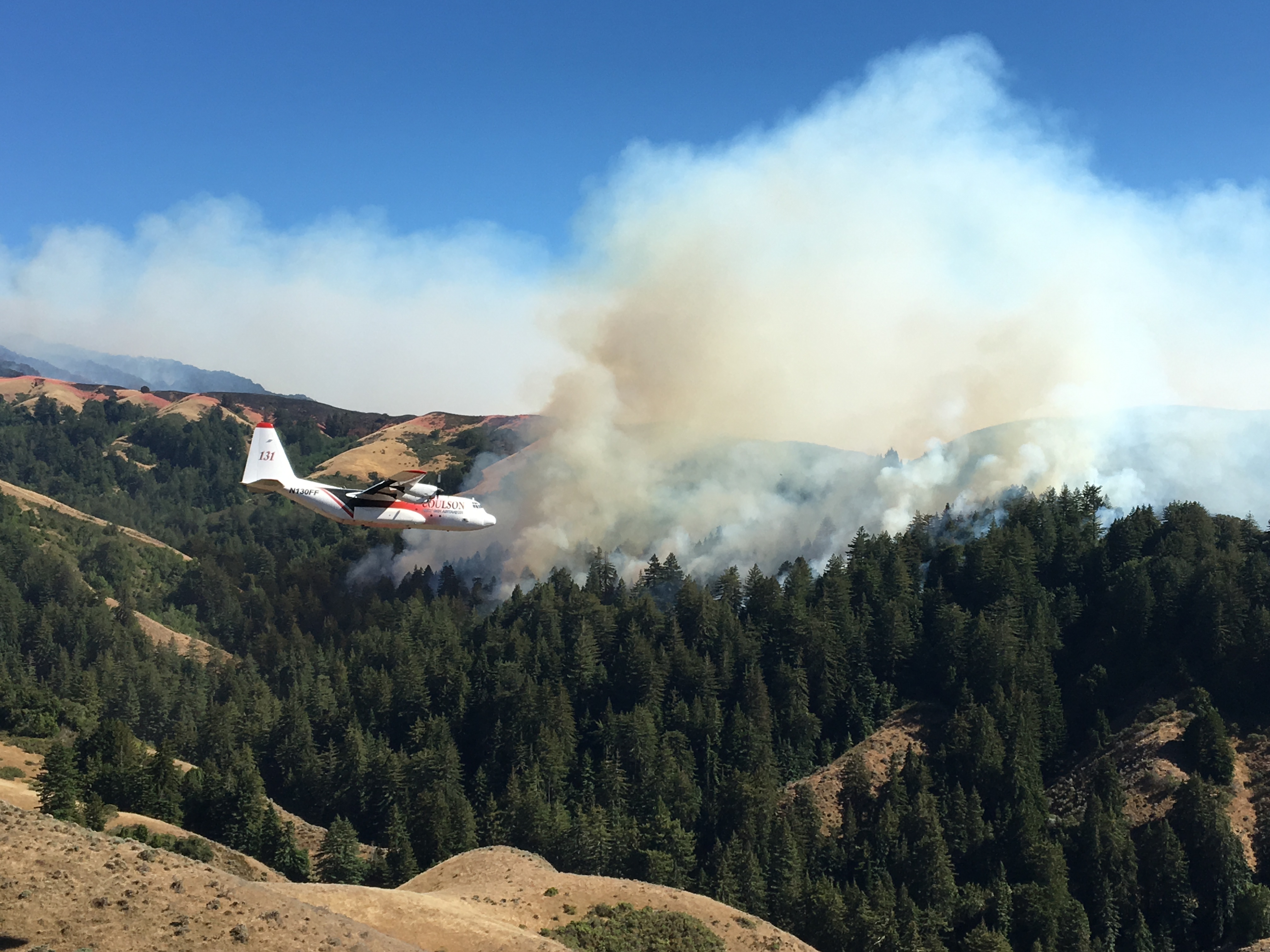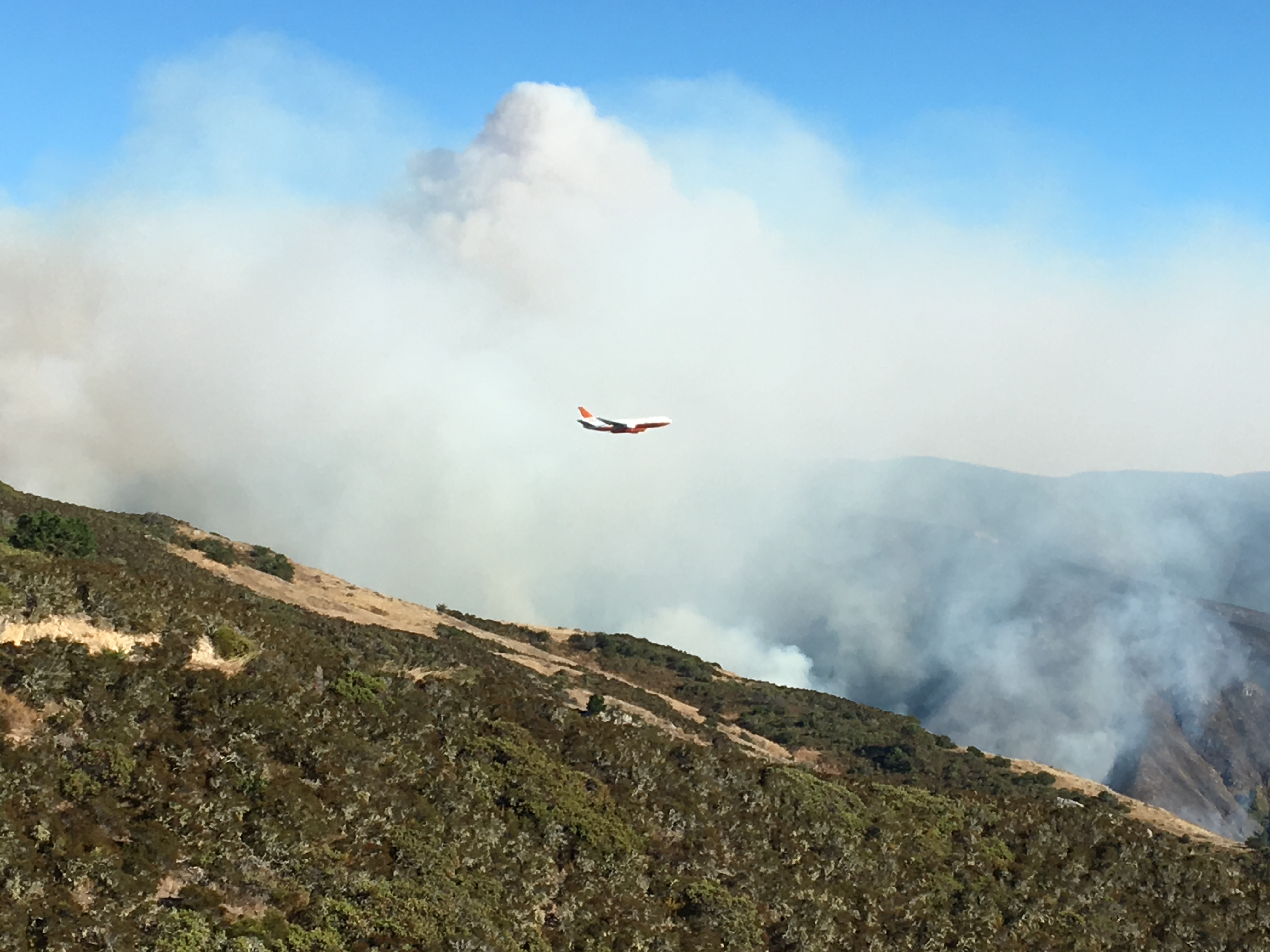 There is still no hard evidence of the fire crossing the North Fork of the Little Sur River and fire officials at tonight’s meeting in Big Sur stated that it had not. There was considerable new heat on the north side of the stream, though, and planes, including the DC-10 VLAT were painting Dani Ridge this afternoon in anticipation of the fire making it across.