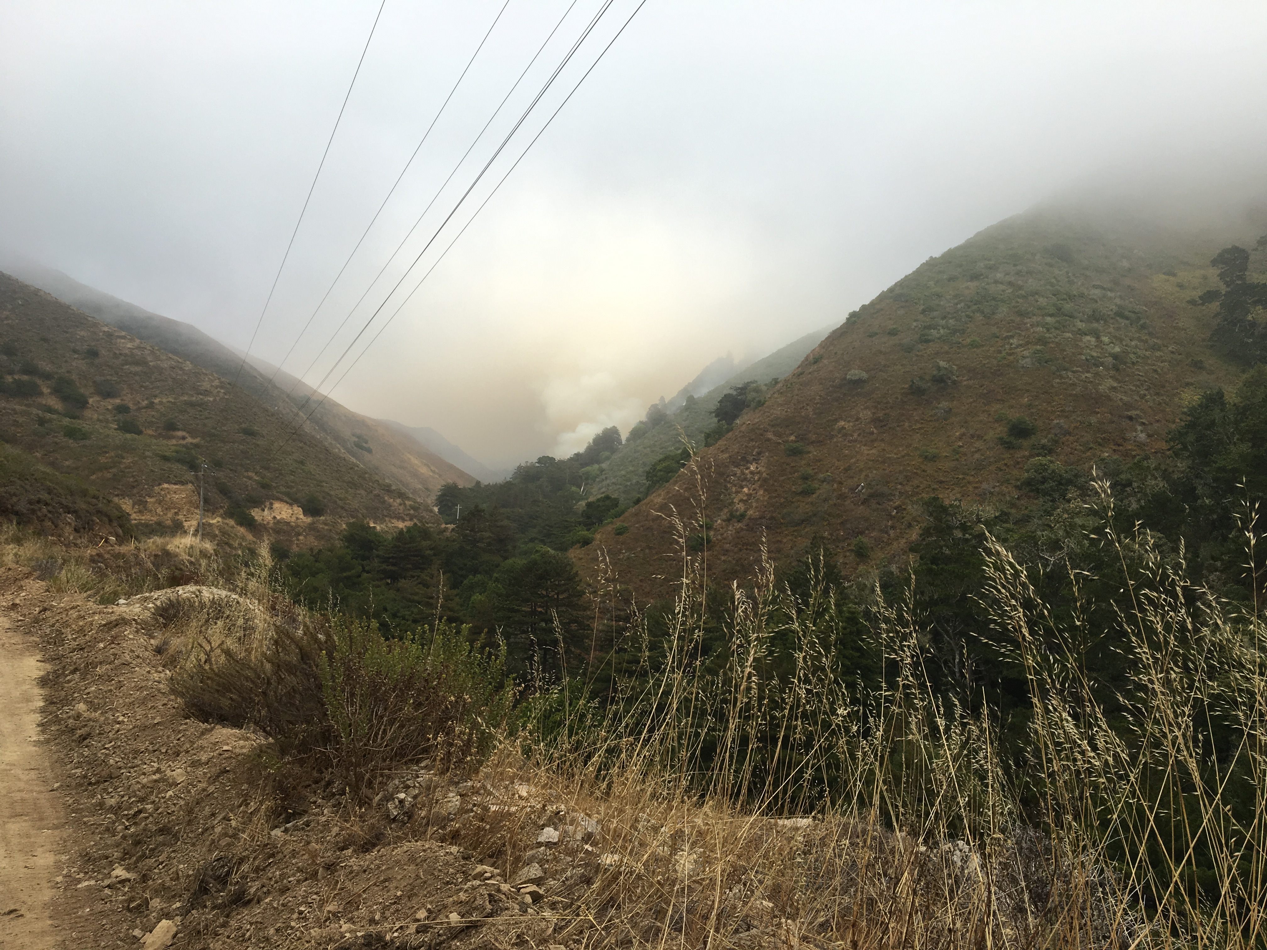 Fire smoldering under the fog in lower Mal Paso Canyon.