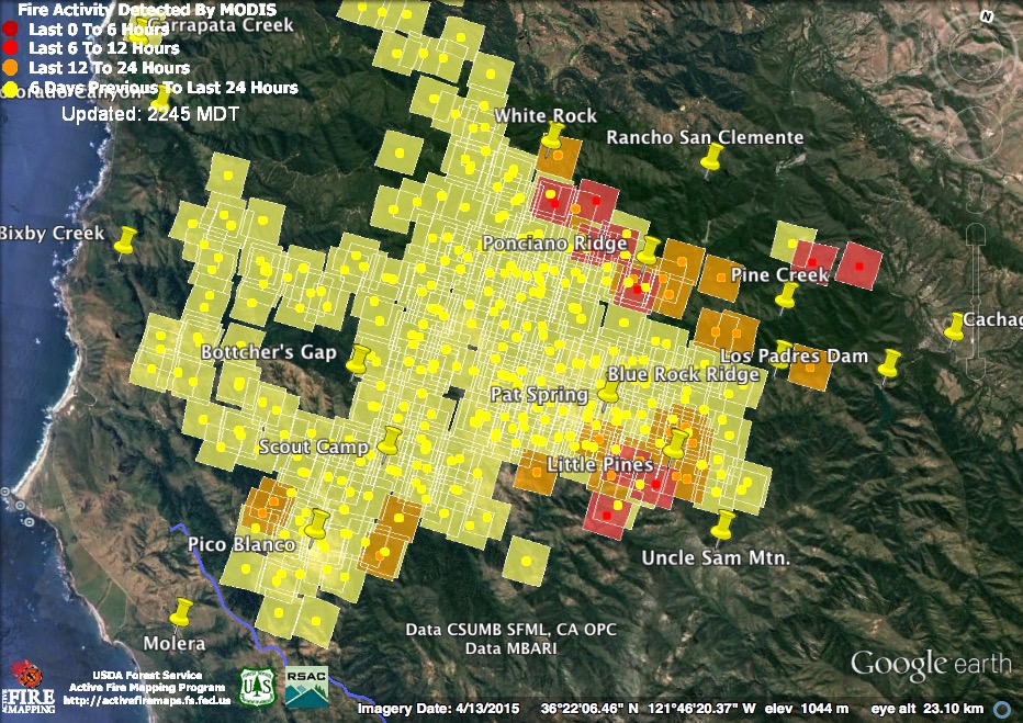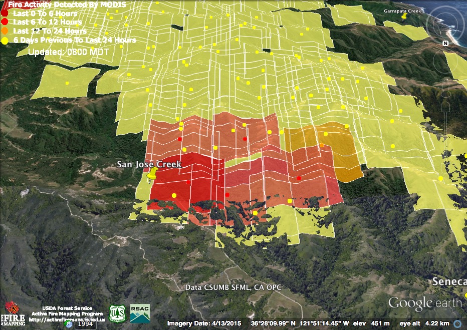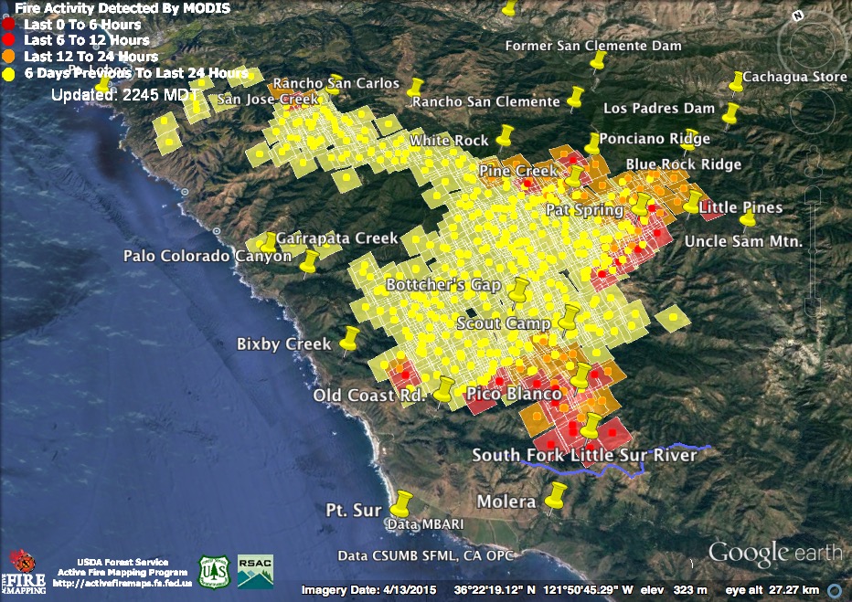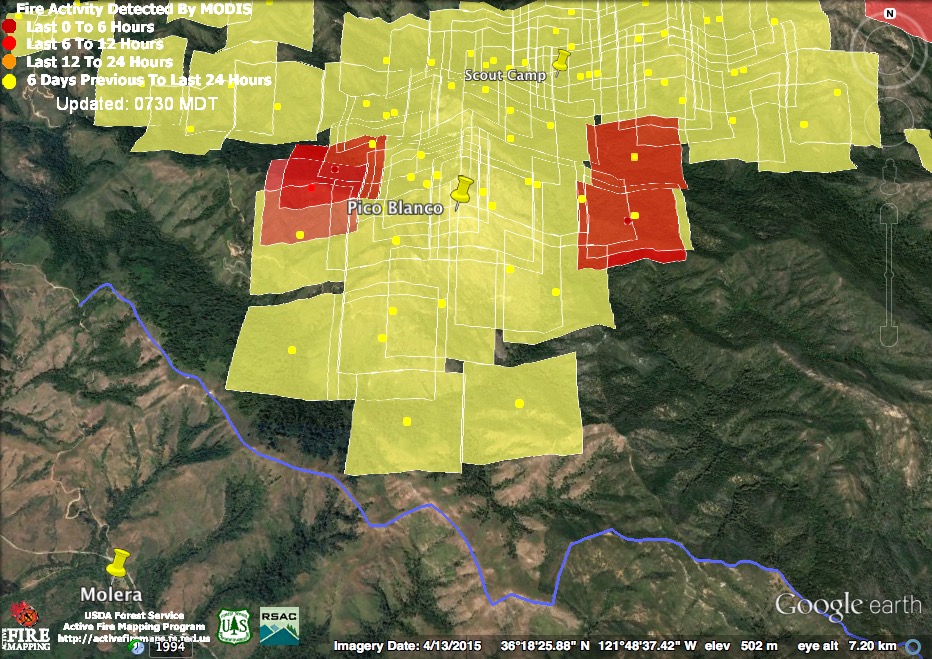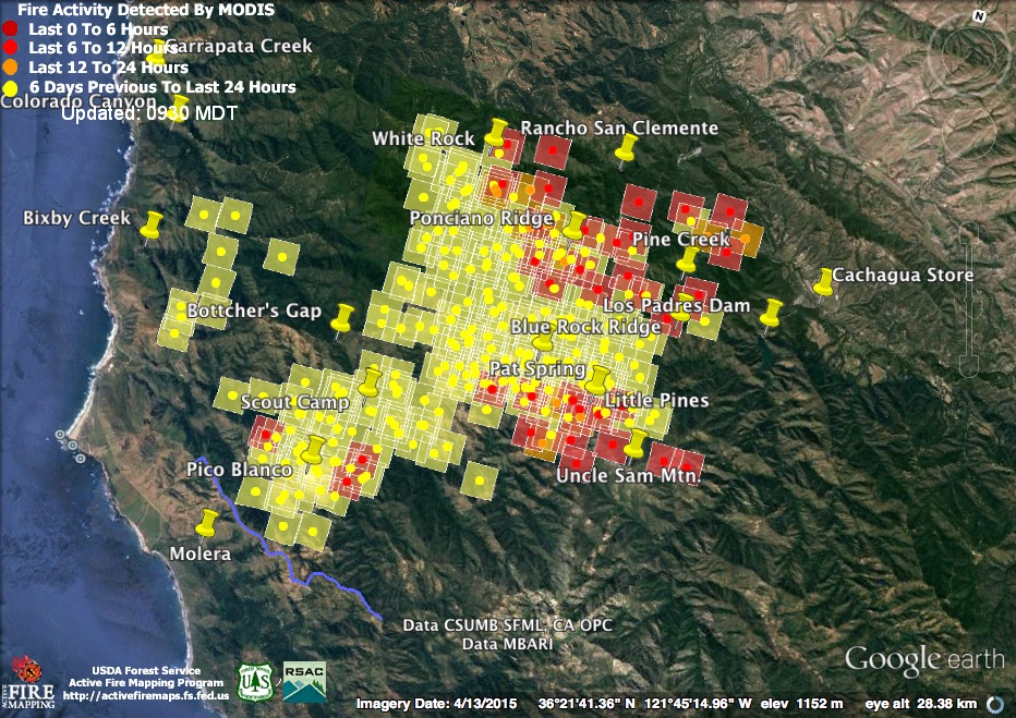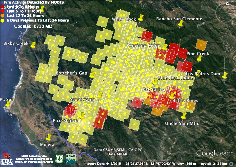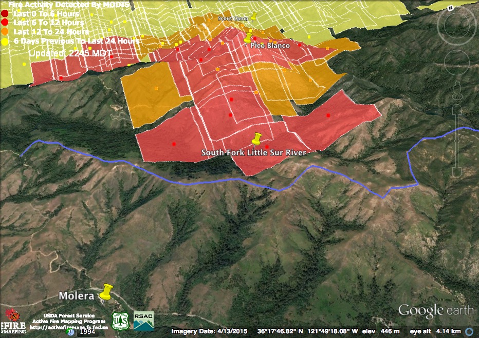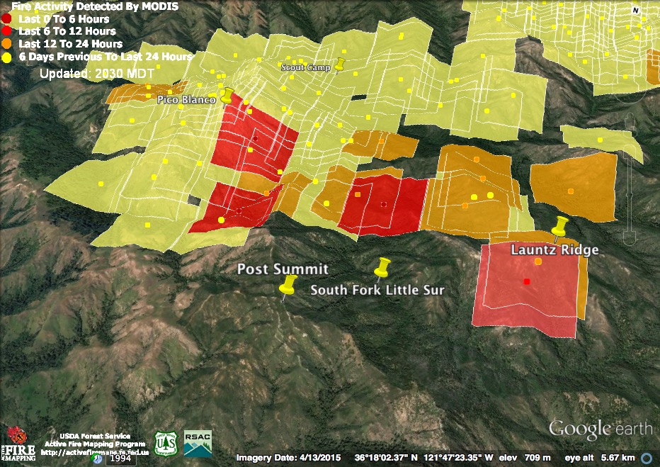A very active night for the fire. Heavy burning around Pico Blanco, in the south, and from White Rock nearly to Little Pines, in the east. The satellites also picked up heat from burn out operations near the top of Serra Grade on the Old Coast Rd. and along San Jose Creek in Rancho San Carlos. Heat detections are from around 11:00 pm last night and around 3:00 am this morning.