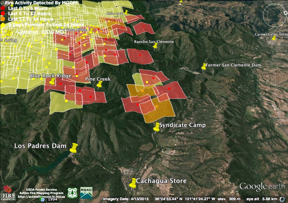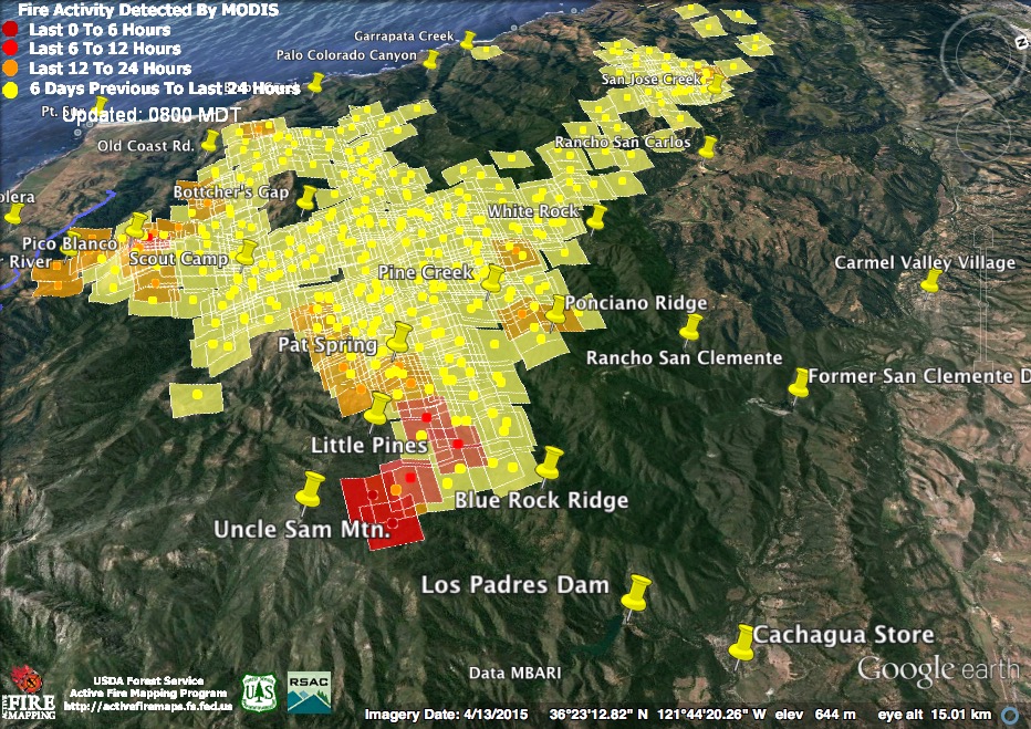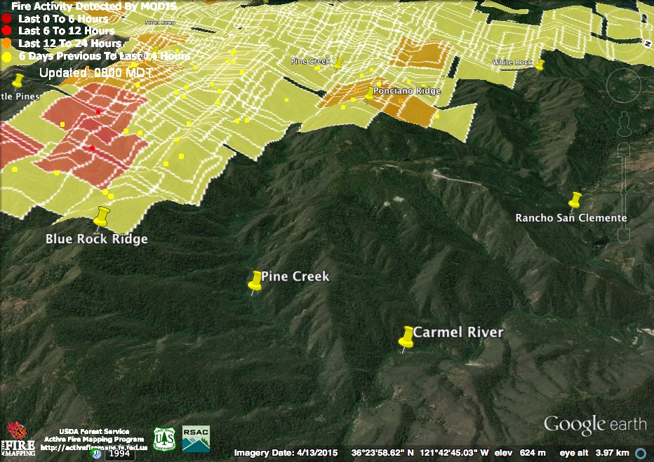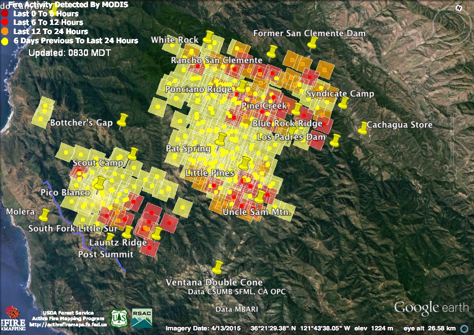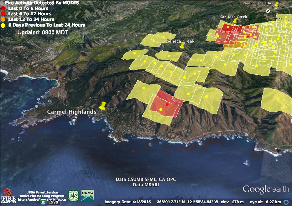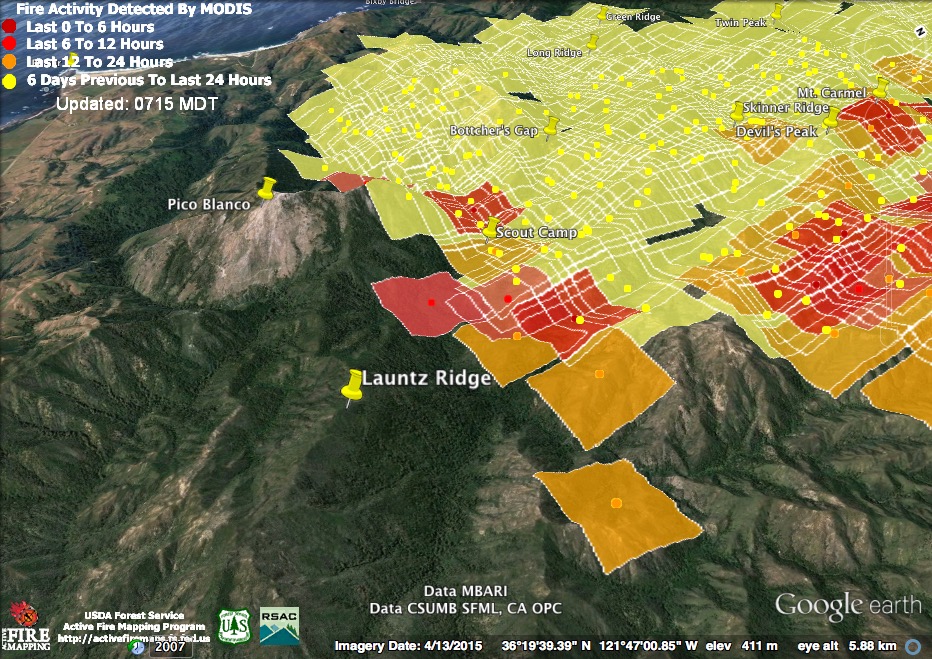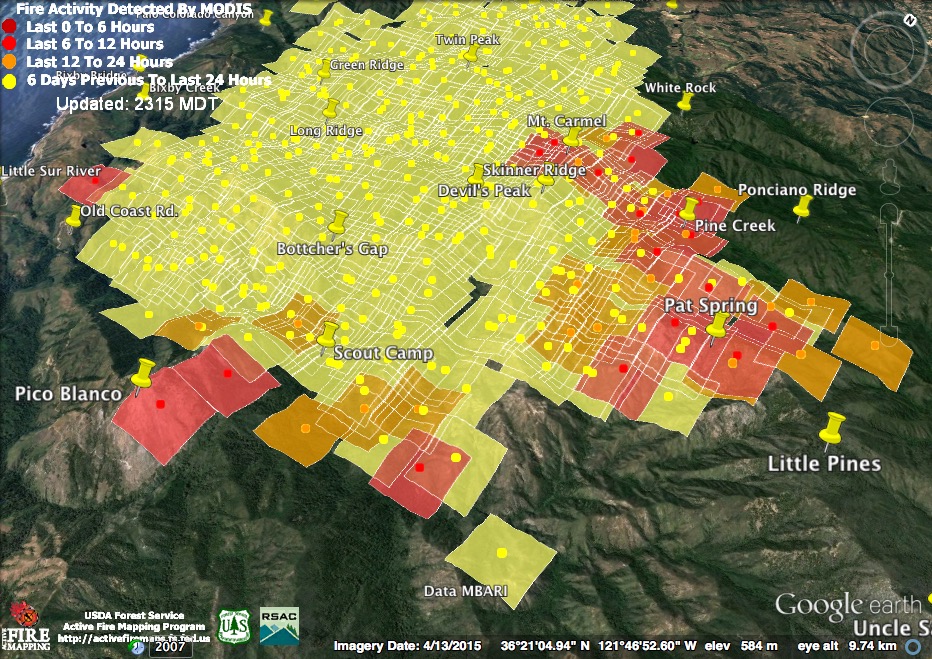 A very active night for the fire. Heavy burning around Pico Blanco, in the south, and from White Rock nearly to Little Pines, in the east. The satellites also picked up heat from burn out operations near the top of Serra Grade on the Old Coast Rd. and along San Jose Creek in Rancho San Carlos. Heat detections are from around 11:00 pm last night and around 3:00 am this morning.
