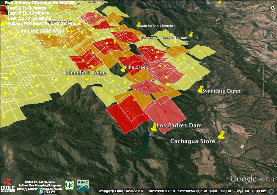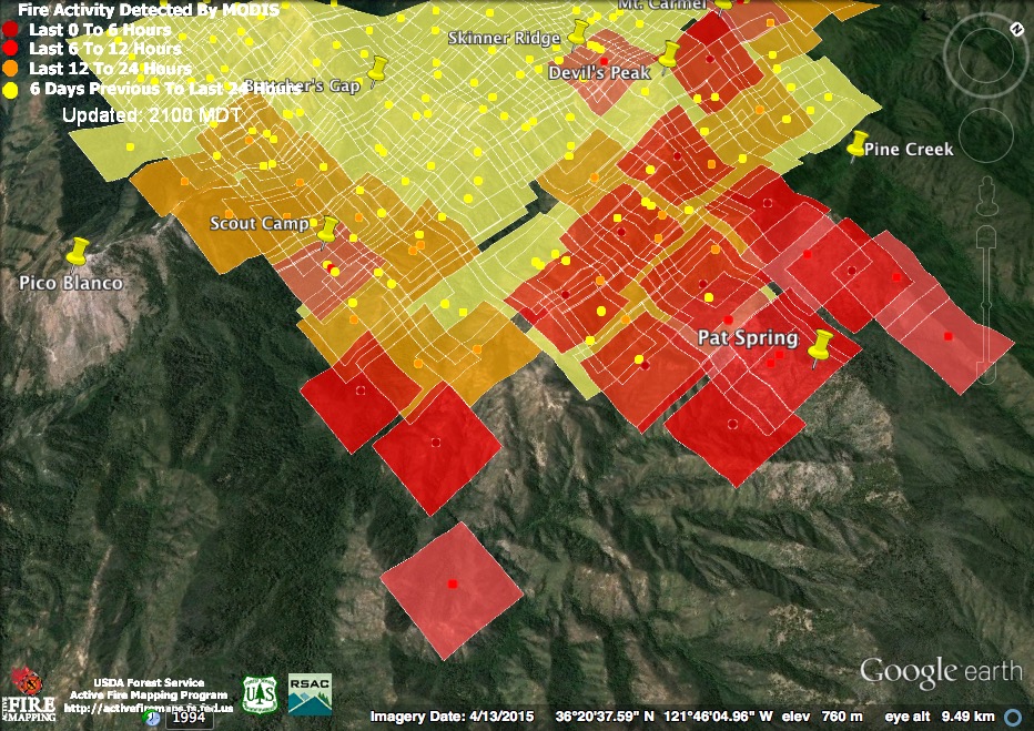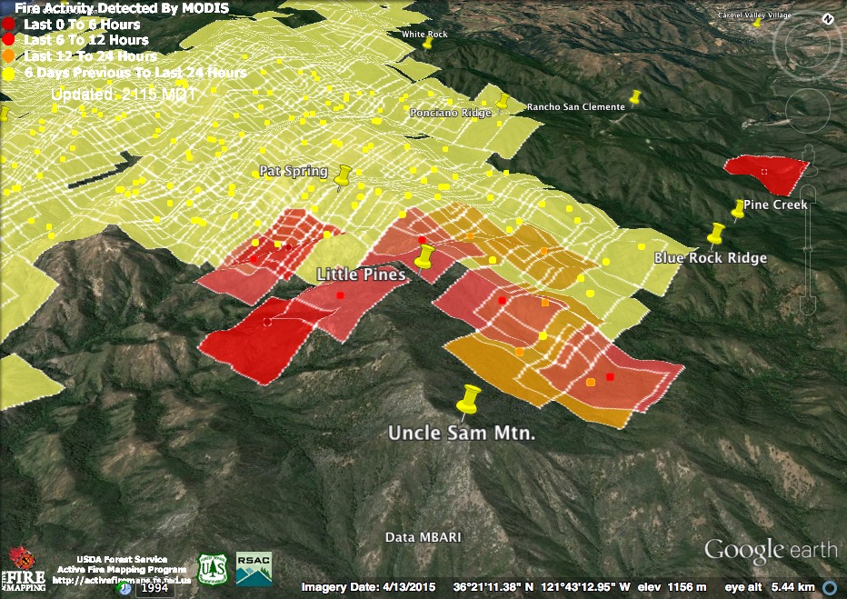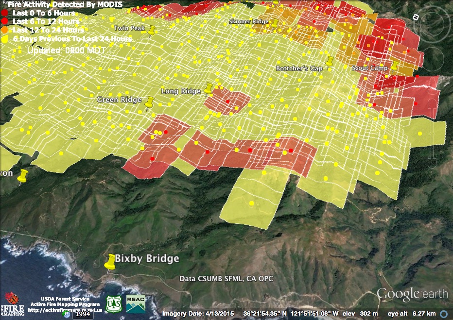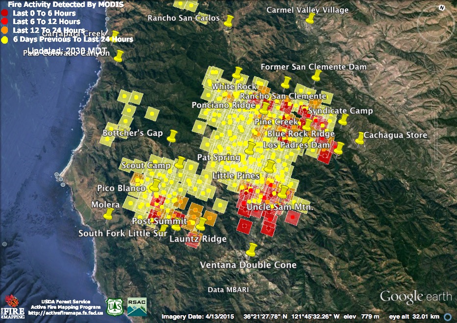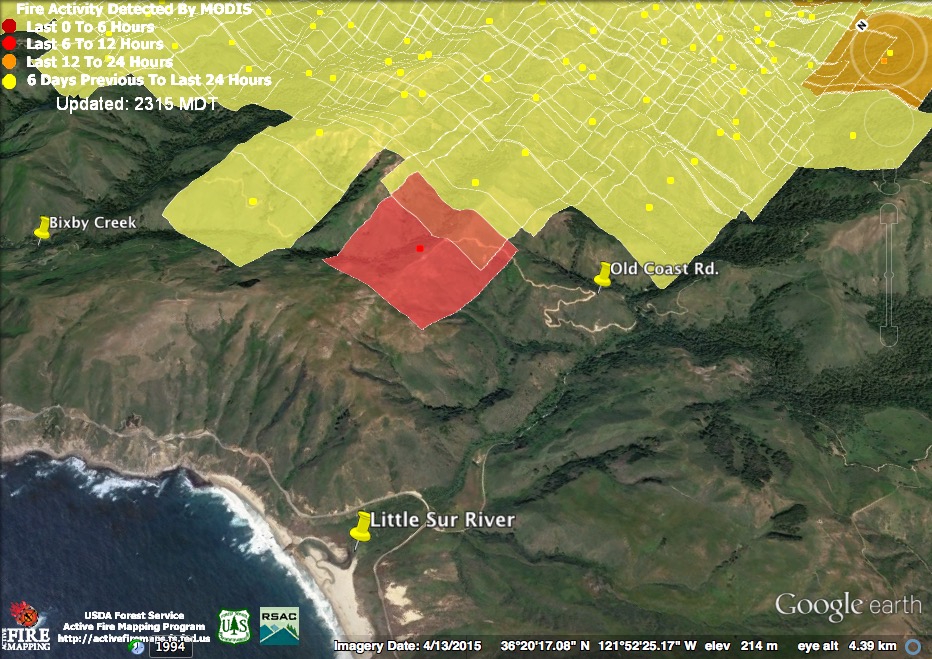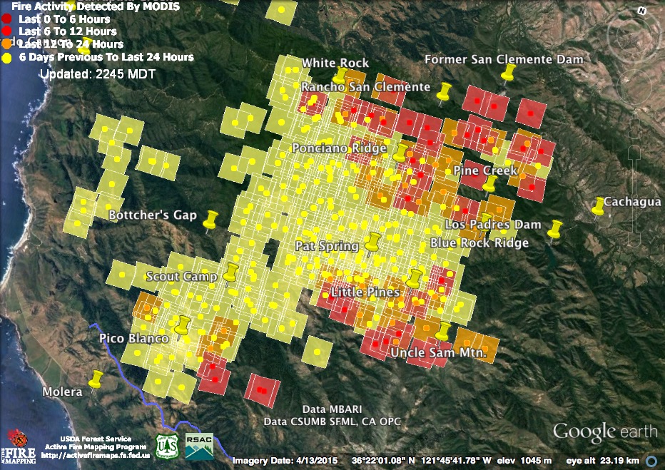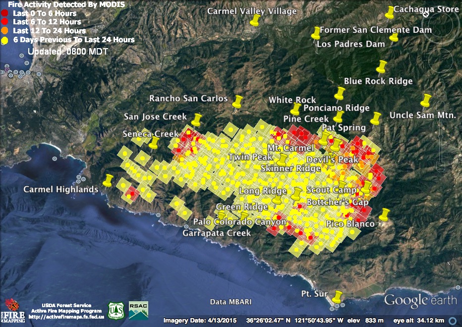A very active night for the fire. Heavy burning around Pico Blanco, in the south, and from White Rock nearly to Little Pines, in the east. The satellites also picked up heat from burn out operations near the top of Serra Grade on the Old Coast Rd. and along San Jose Creek in Rancho San Carlos. Heat detections are from around 11:00 pm last night and around 3:00 am this morning.
