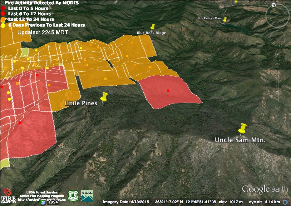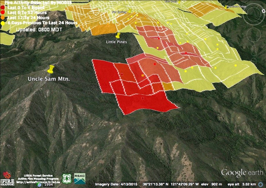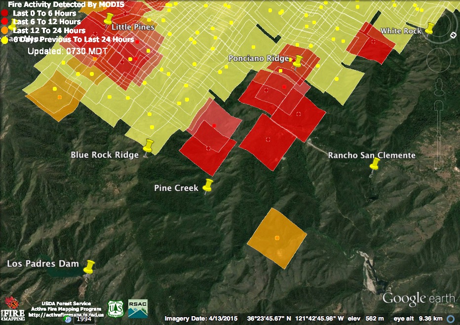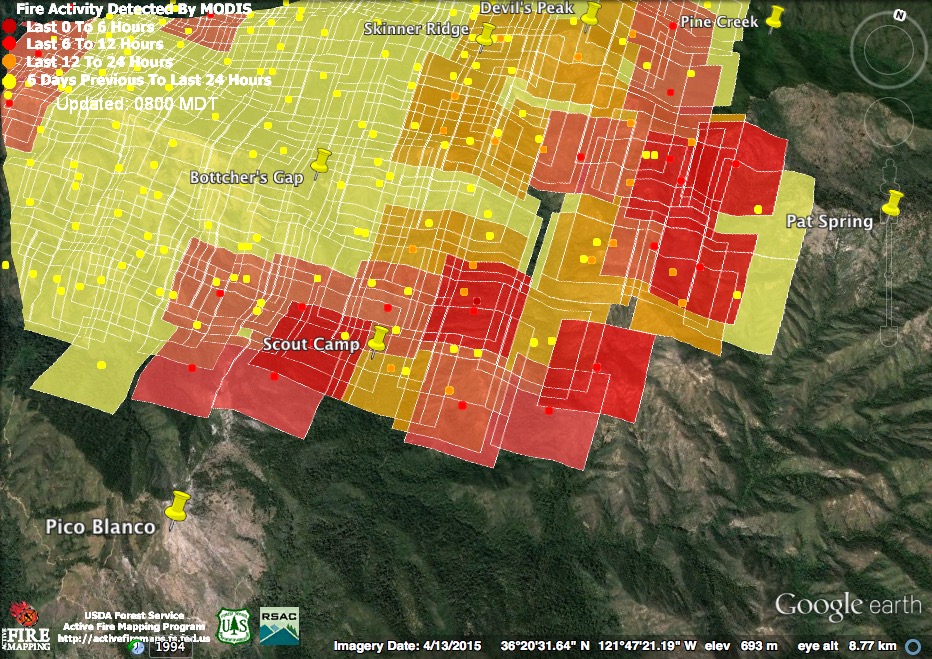 The fire spent the day continuing it’s southern and eastern expansion. The light red squares were detected around 1:00pm and the dark red squares around 2:30 pm.