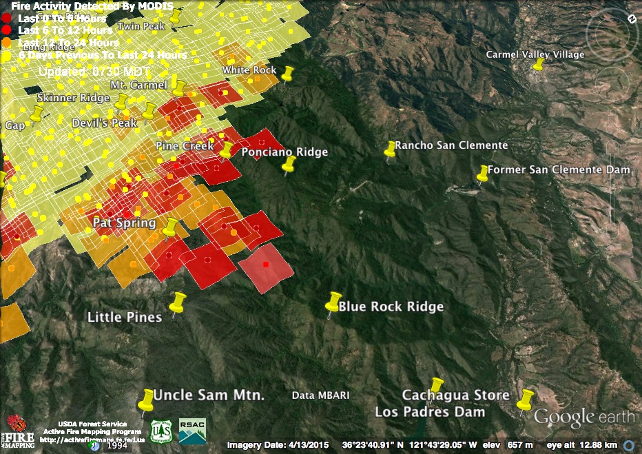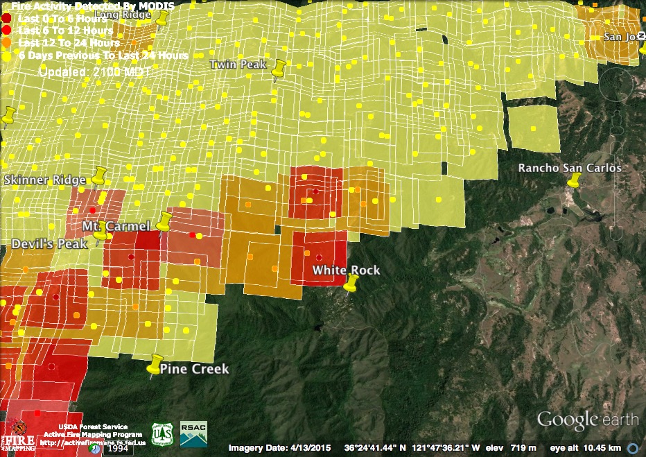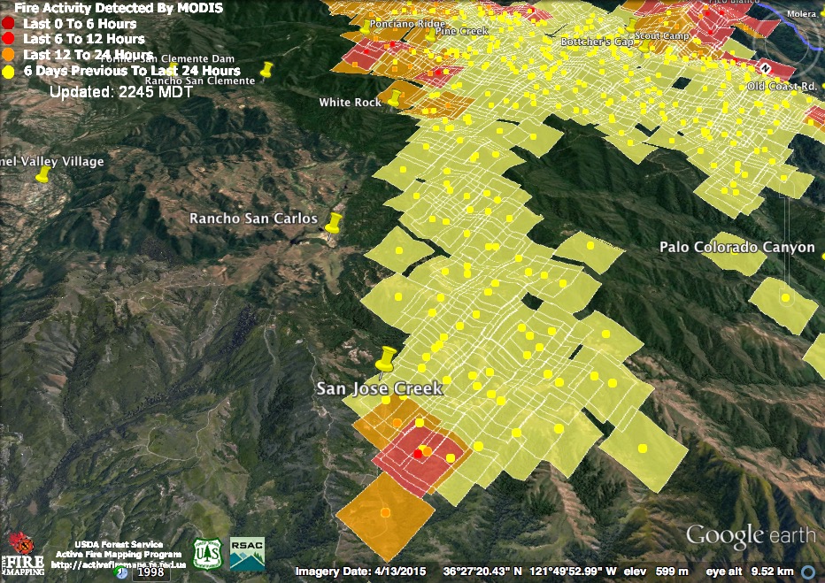 Most, if not all, of the new heat detections between Blue Rock Ridge and White Rock are the result of ongoing burn out operations. There were no new heat detections from close to the Carmel River – probably because the marine layer kept the burning there too slow to be noticed by the satellites.