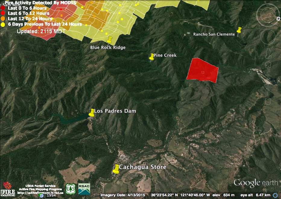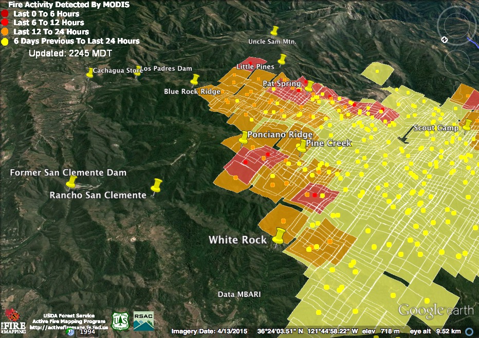 The burn out operation on both sides of the Carmel River downstream of Syndicate Camp, in Cachagua, was clearly visible to the overnight satellites. The main fire on Blue Rock Ridge also appears to have had an active night. Heavy burning was detected throughout upper Pine Creek and on both sides of Ponciano Ridge. The outlying heat detections near Rancho San Clemente and White Rock, on the other hand, are the result of burn out operations. Thanks to the favorable conditions that have made these extensive burn out operations possible, the fire is unlikely to progress further to the north toward Carmel Valley.