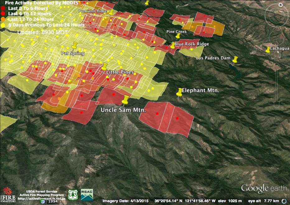 The latest heat detections suggest that the fire is moving south from Little Pines, burning around Uncle Sam Mountain to the west, toward the Puerto Suelo saddle and exiting the Rattlesnake Creek drainage through the gap between Uncle Sam and Elephant mountains. This fire may now be backing toward the Carmel River in the vicinity of Sulphur Springs and Buckskin Flats camps.
