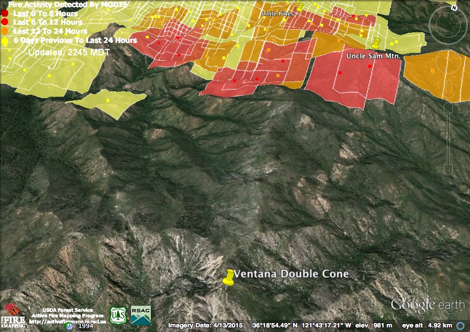 Yesterday I wrote that the fire around Uncle Sam Mountain looked poised to run up the high brushy ridge to the Ventana Double Cone and today it began to do it. The detections suggest a broad fire front stretching well into the Little Sur and Carmel River watersheds on either side of the ridge.
