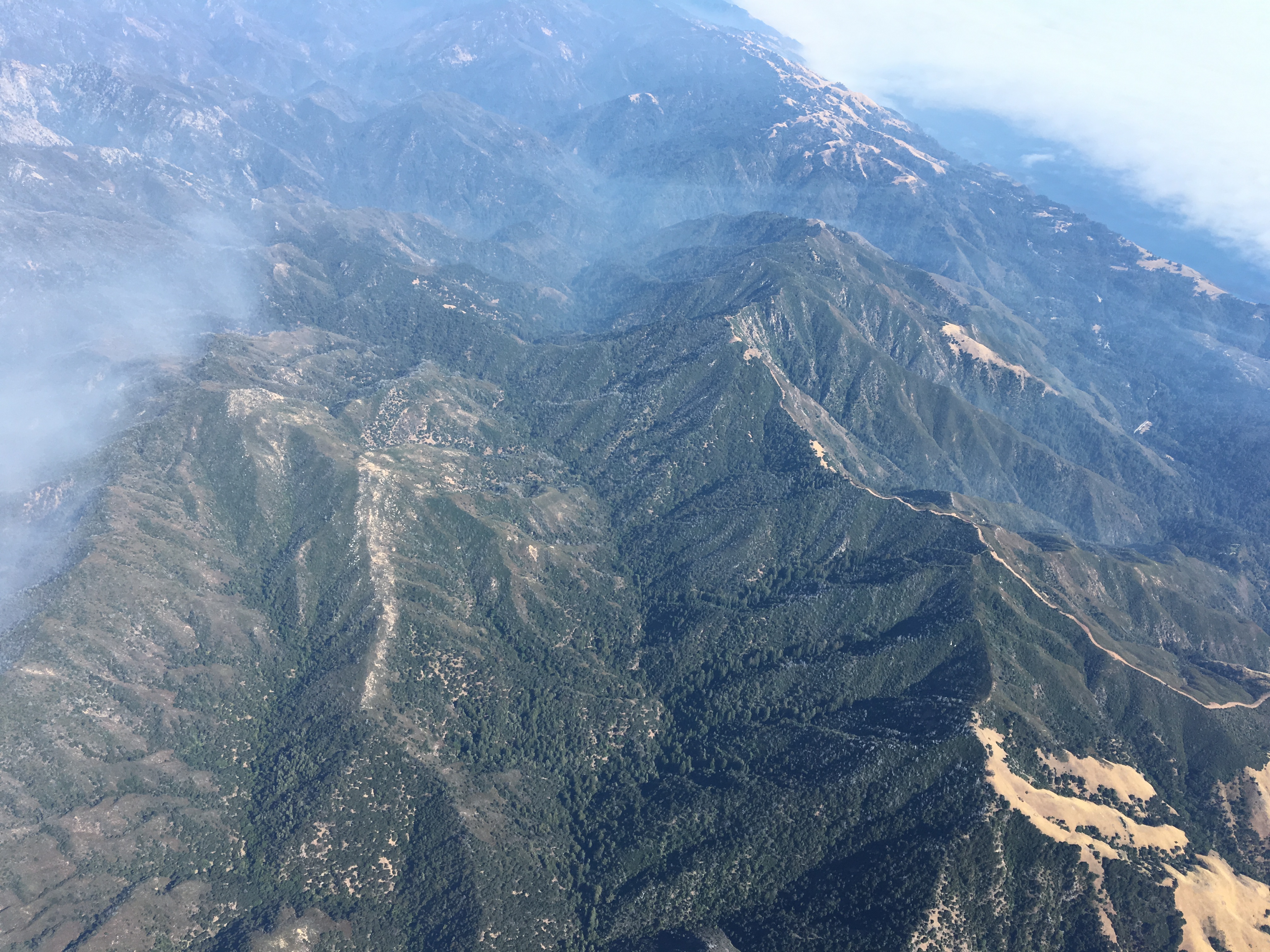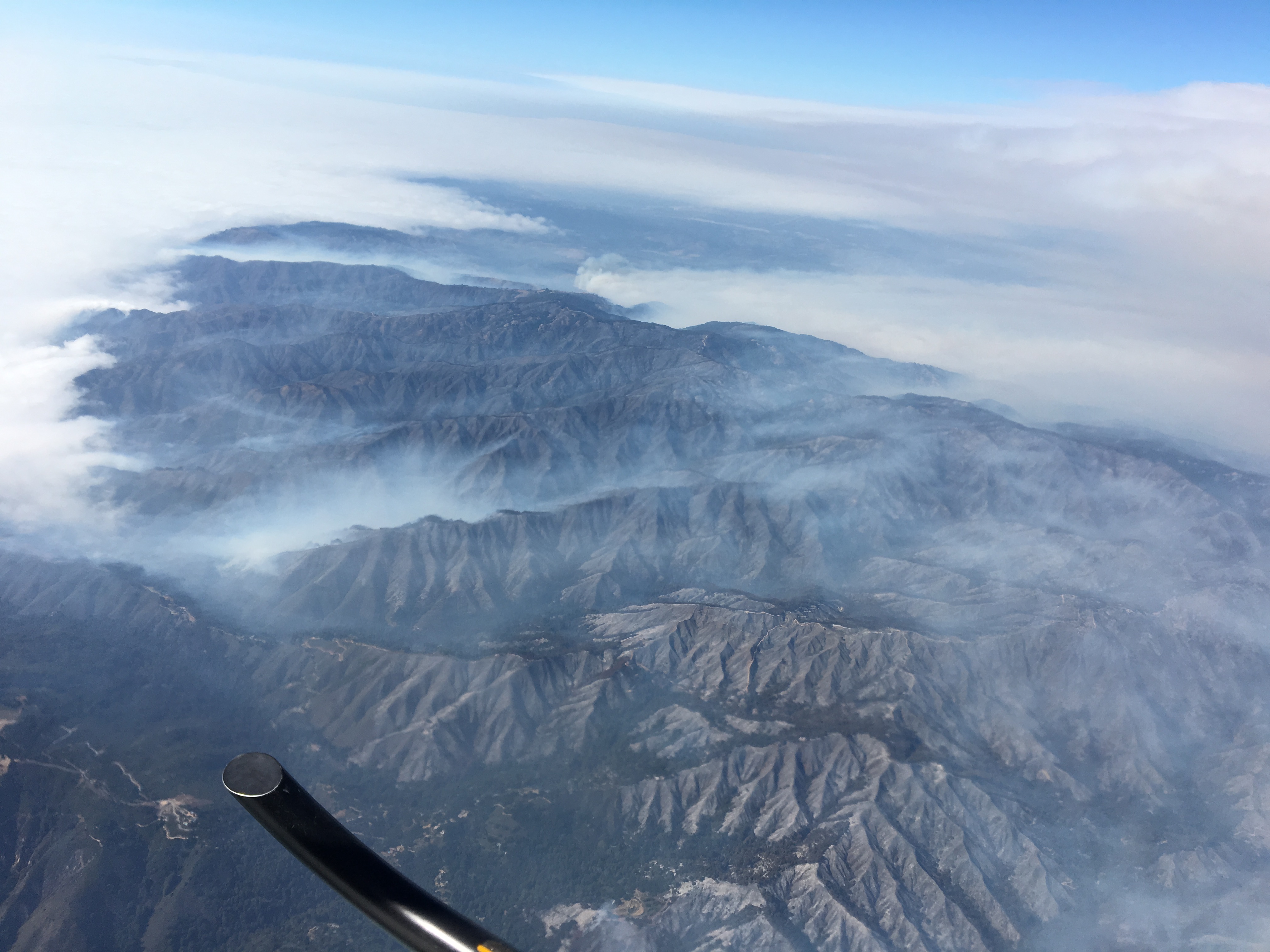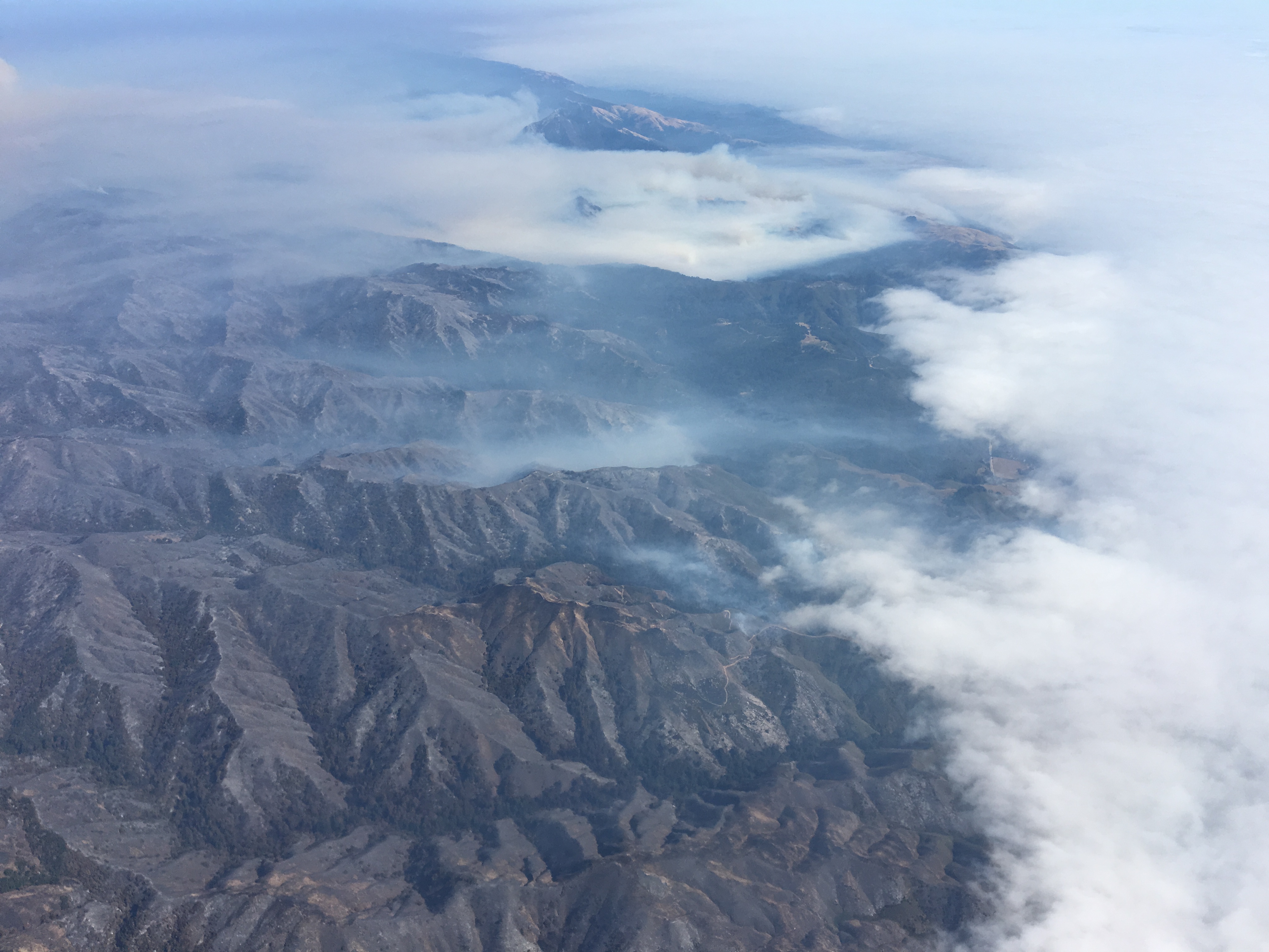 The coastal canyons looking south: One black, smoking ridge after another. The canyon in the foreground is Doud, followed by Joshua (where fog meets smoke), Wildcat (filled with smoke), Garrapata, etc.