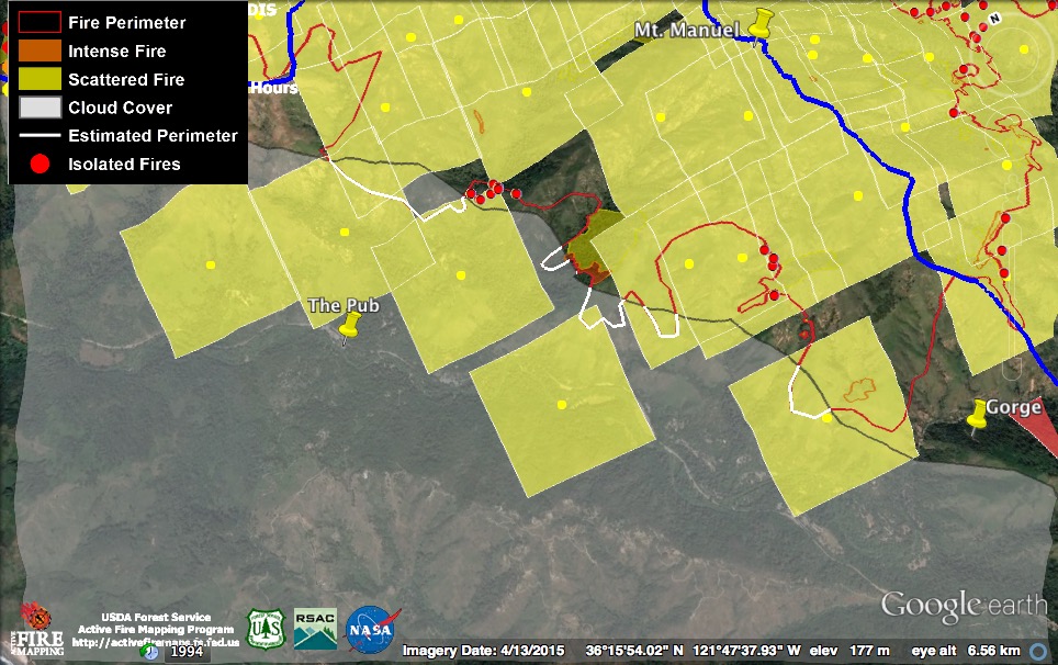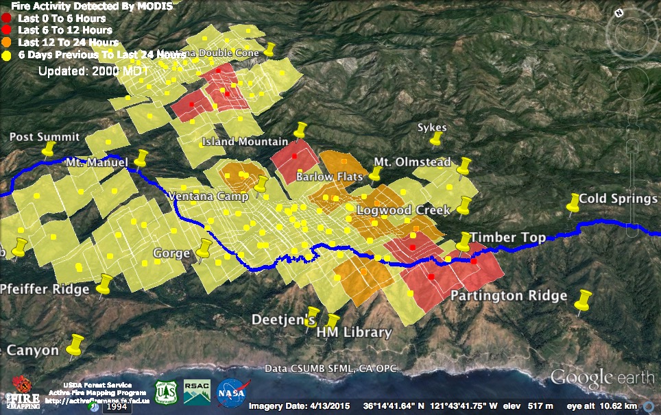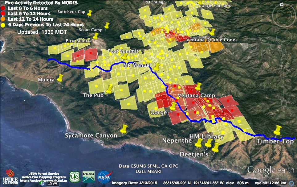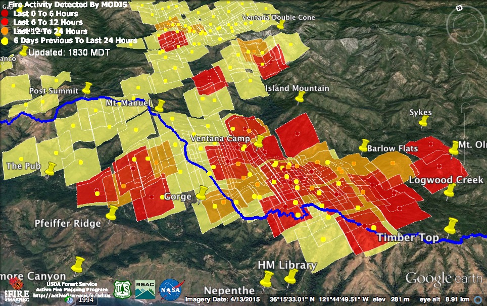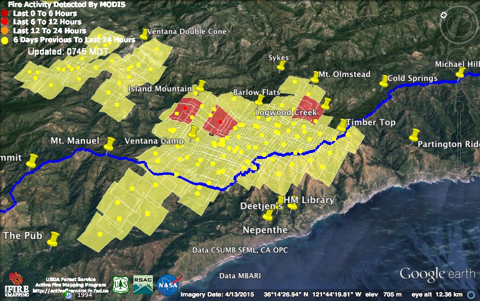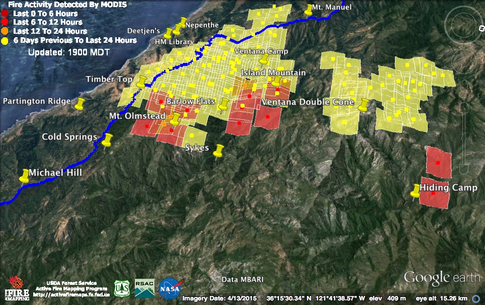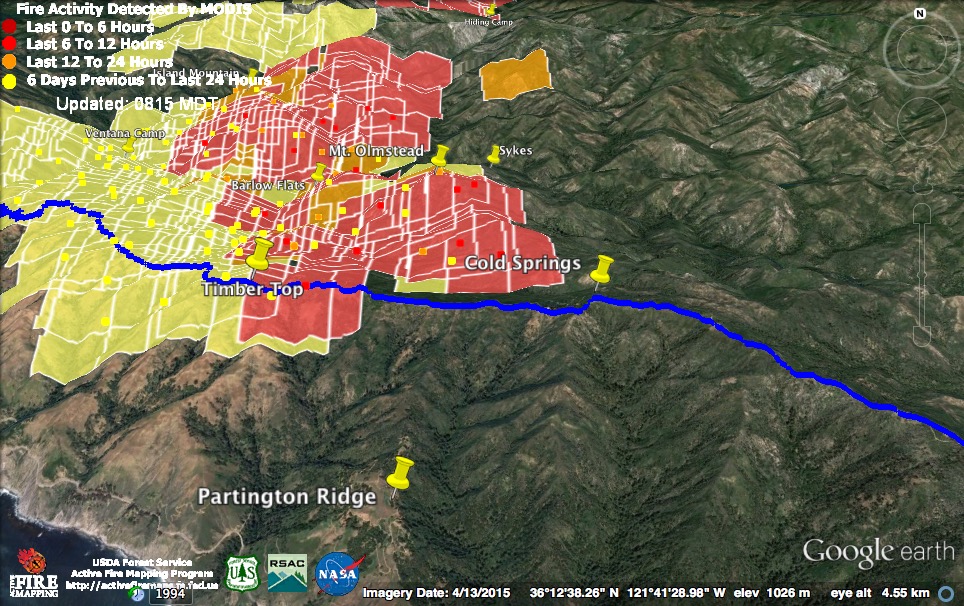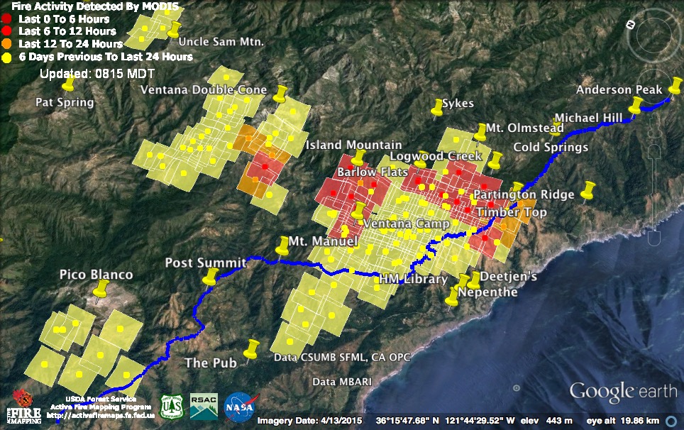 The fire continued to be very active on the back side of the Coast Ridge overnight. Heat was also detected around the firing operations in the Big Sur Valley, near Pico Blanco, near the Ventana Double Cone, and on Rattlesnake Creek. Heat detections were acquired around 11:30 pm last night (light red squares) and around 3:30 am this morning (dark red).