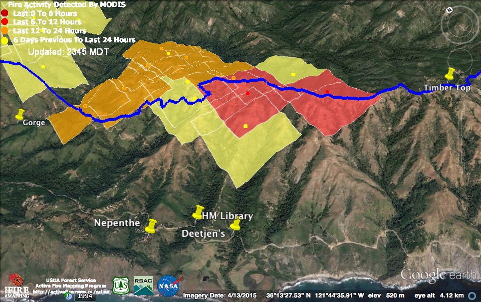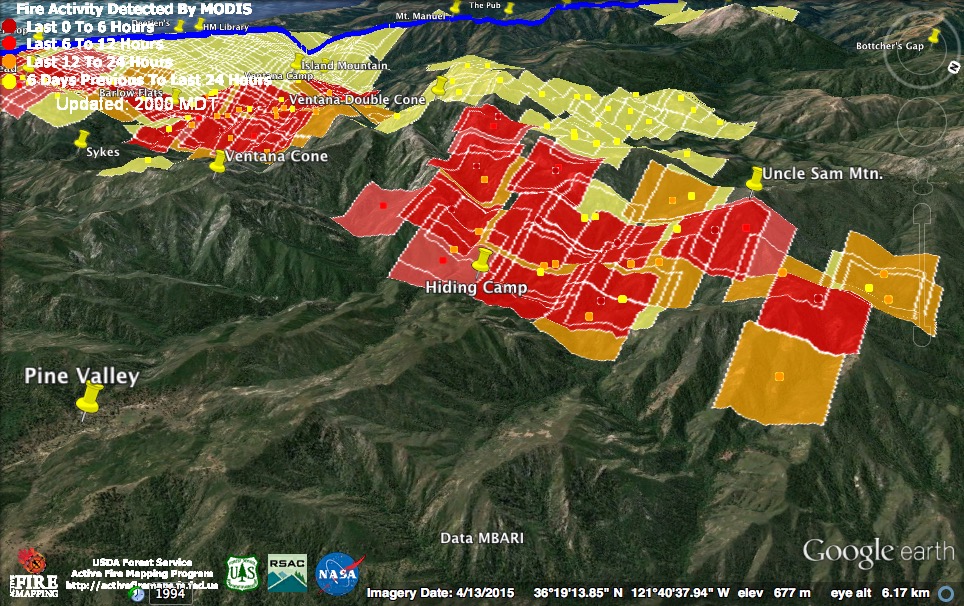 Pretty much everything from Ventana Creek to Lion Creek and from the Ventana Double Cone to the Big Sur River appears to have been on fire last night. While there’s no way to tell whether the outlying orange square, from around 3:30 yesterday afternoon, is accurate or not, it really doesn’t matter. The fire will be there soon enough.