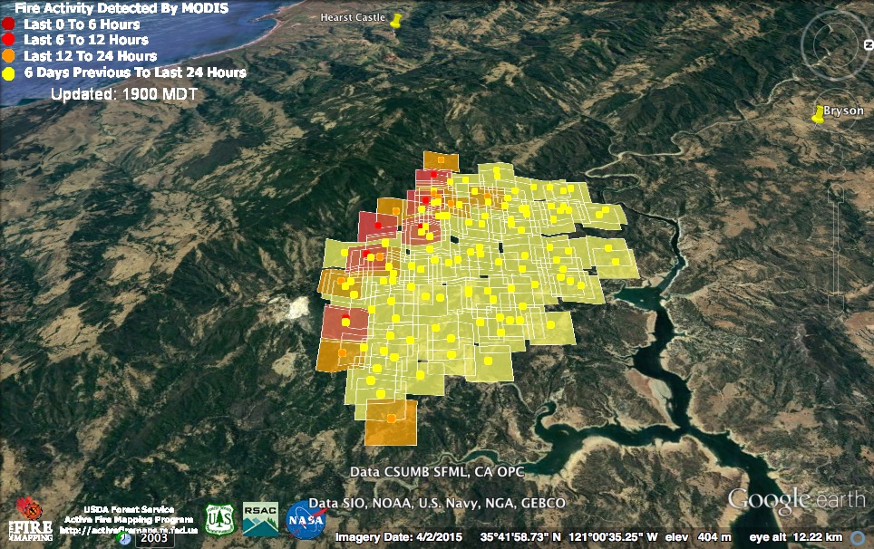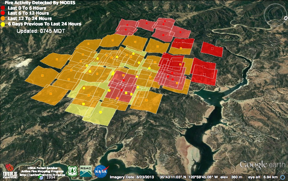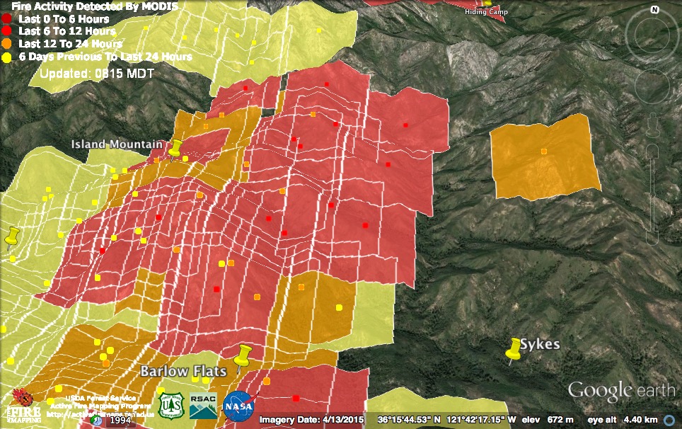 Also be aware that yellow squares disappear from the map after 6 days. These are not maps of the area burned since the fire began, just maps of where heat has been detected during the past week.