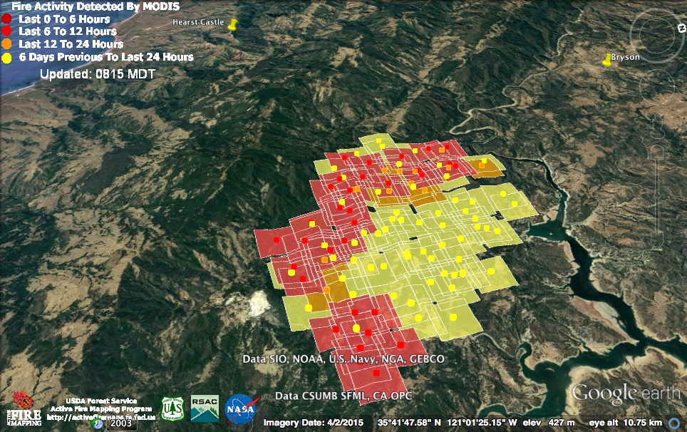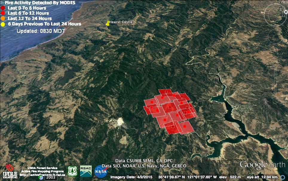 Until late afternoon, it was also a quieter day on the Chimney Fire, near Lake Nacimiento. The light red heat detections were acquired around noon, the dark red around 1:30 pm. At the time of the satellite passes, most of the burning had taken place inside the fire’s perimeter. Later in the day, though, a spot fire flared up outside the lines and began creating containment difficulties. The fire has burned more than 5,400 acres and is just 10% contained.