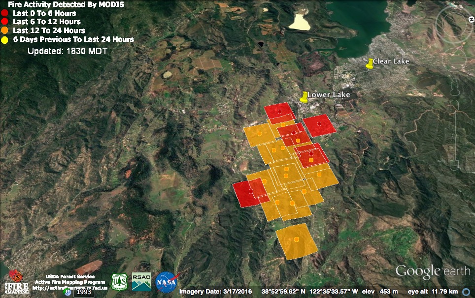 The 2:30 pm satellite pass found the Clayton Fire poised on the outskirts of Lower Lake. It has since overrun the town, with many homes and historic commercial structures destroyed, and is currently burning structures on the outskirts of the city of Clear Lake.