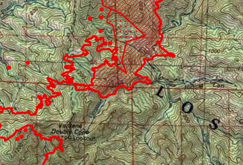 The red marker designated “SP Wilderness” indicates the approximate location of the southeast corner of the Silver Peak Wilderness. One more westward push and the fire could easily be there.