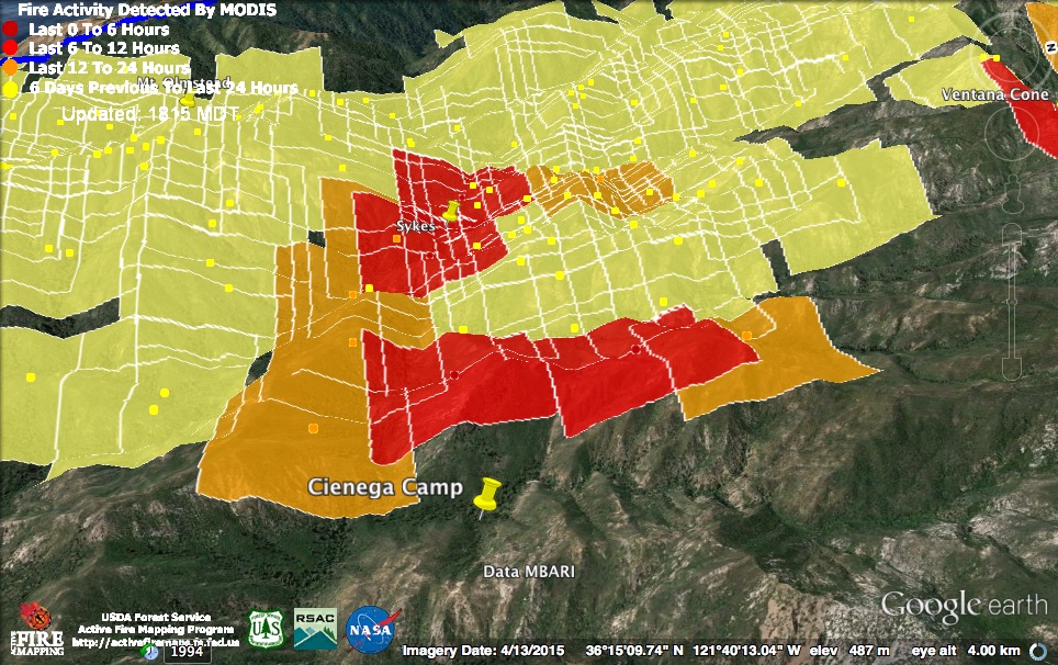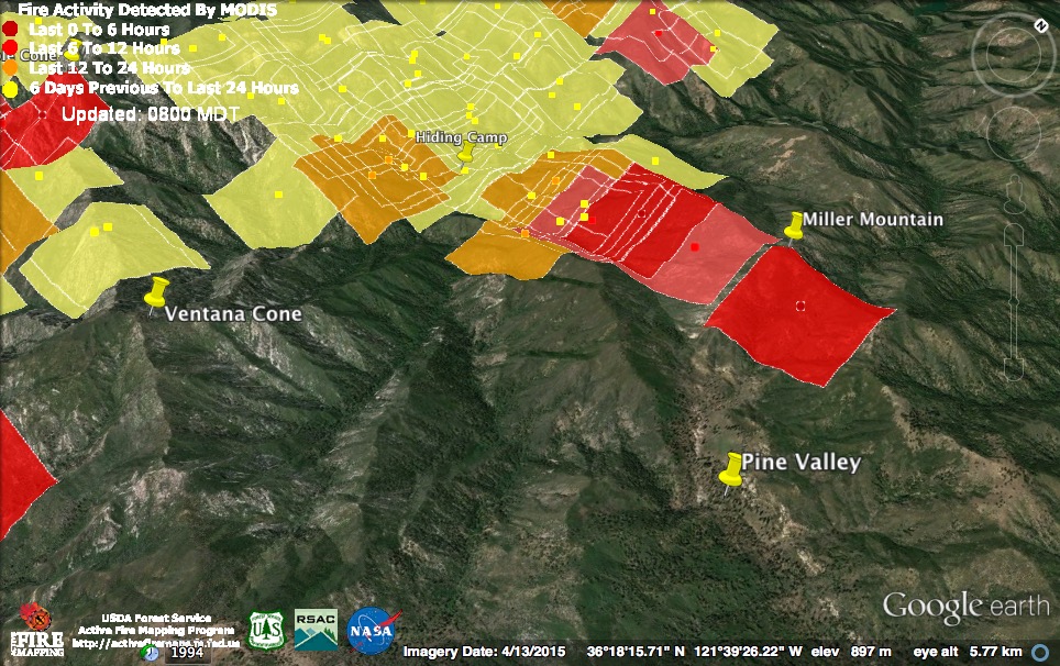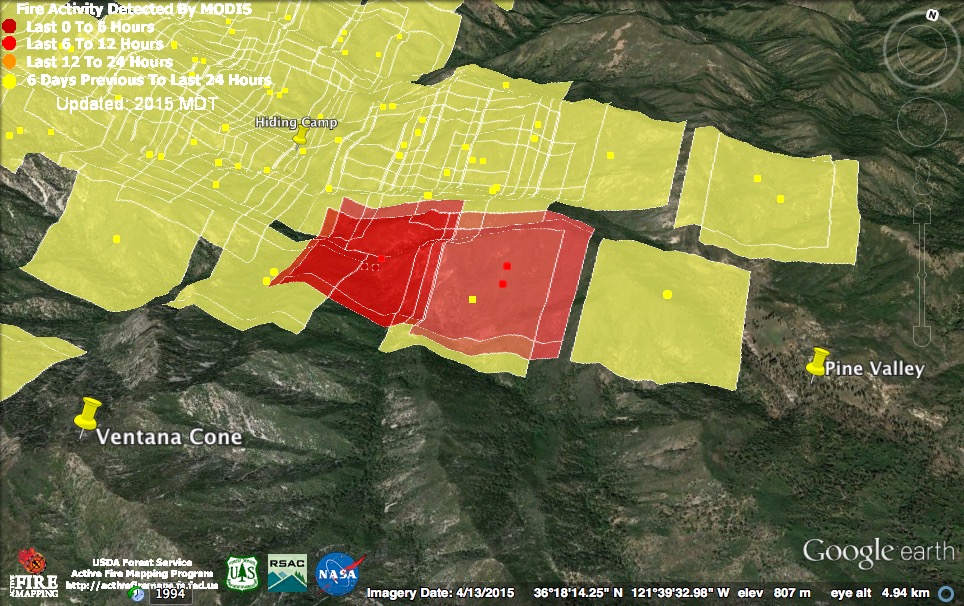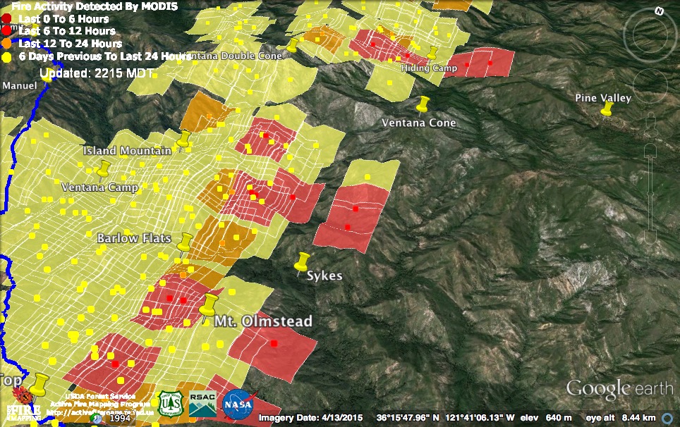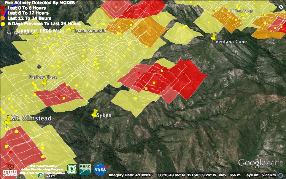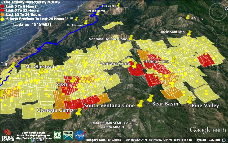 Active fire remained deep in the Ventana Wilderness today. Light red squares were acquired around noon; dark red squares around 2:00 pm.