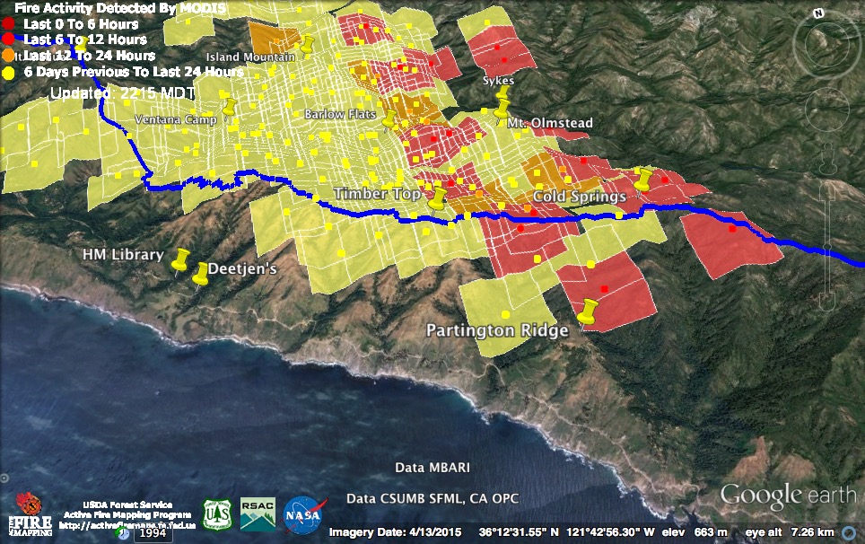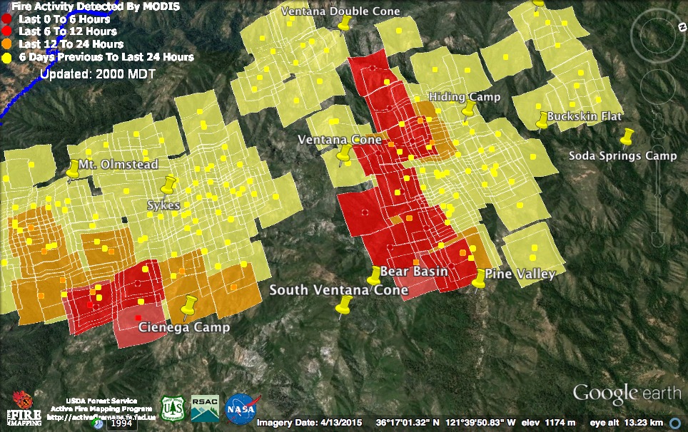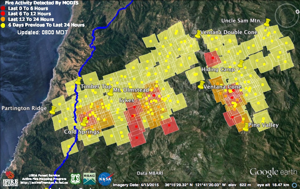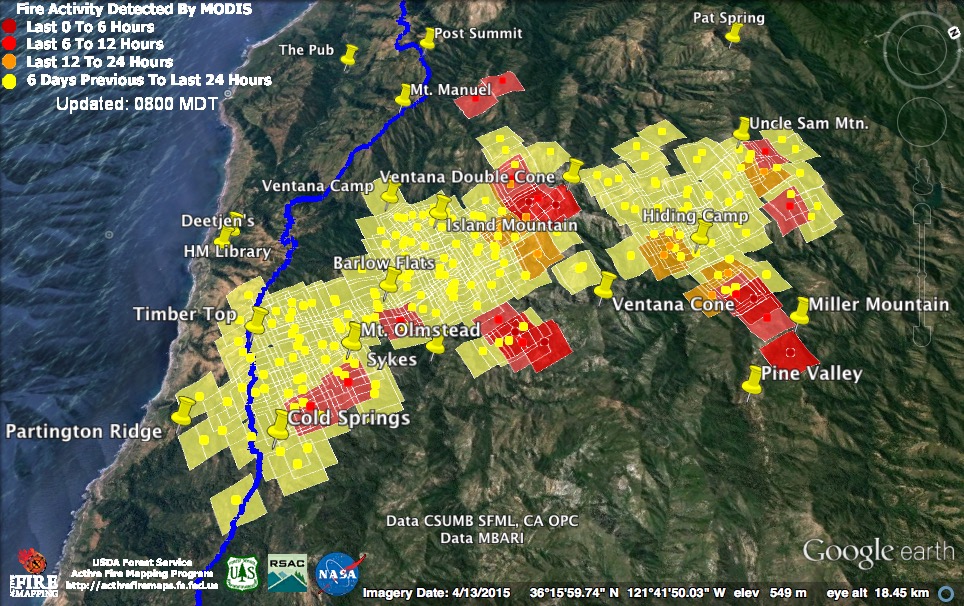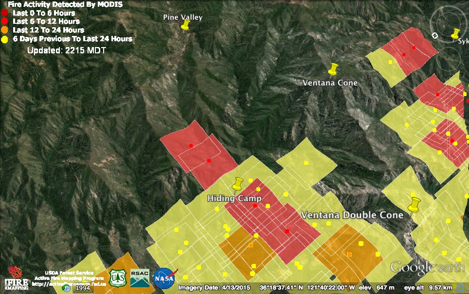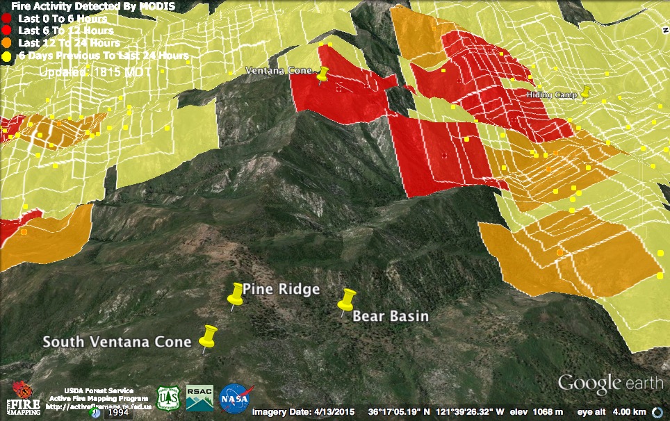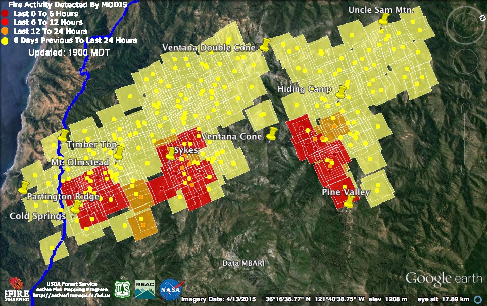 Active fire remained deep in the Ventana Wilderness today. Light red squares were acquired around noon; dark red squares around 2:00 pm.