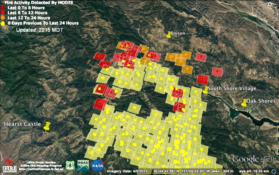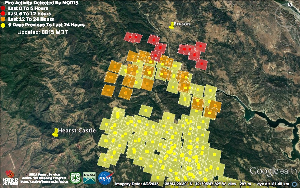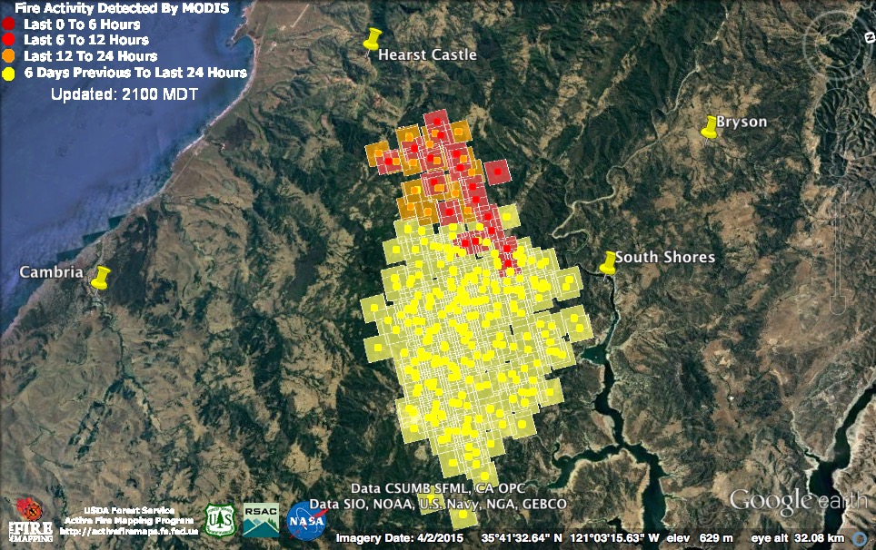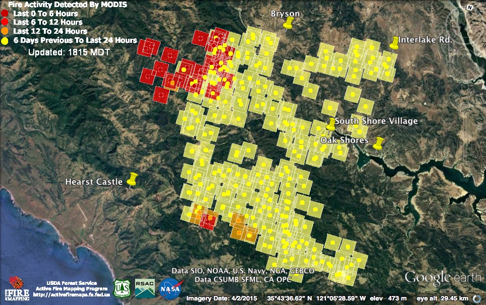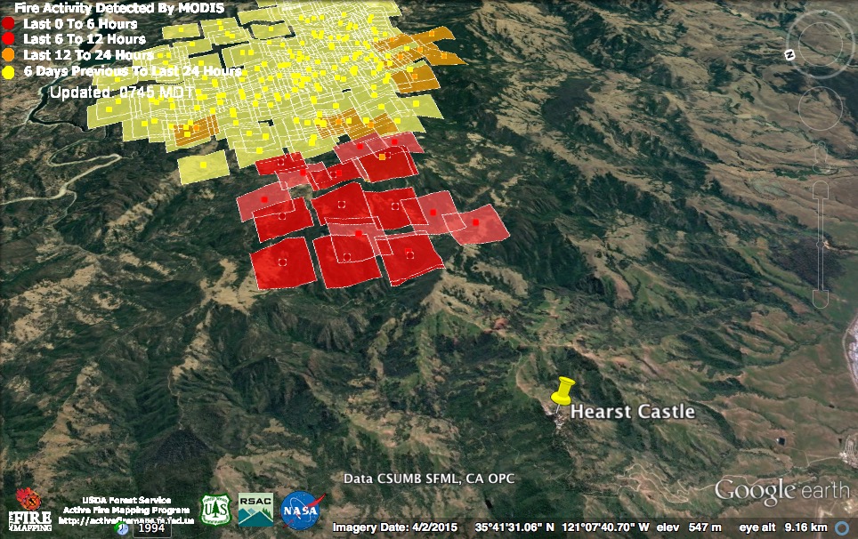 Just when it looked like the Chimney Fire might be winding up, it takes another big run to the west. Cal Fire reports that fire behavior during this run was “extreme,” and notes that Hearst Castle remains threatened. Remember that the fire has likely burned on beyond the position pictured here (which is based on the 3:00 pm satellite pass).