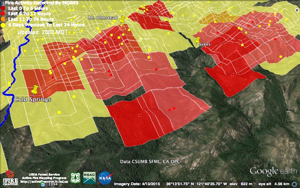 Important caveats: Please note that the squares on the heat detection maps represent the expected margin of error, not the size of the area burned. In other words, the detection could have come from anywhere within the square. Also be aware that false detections do sometimes occur. An outlying or “over the line” heat detection is not, by itself, a confirmation that there is fire in the area indicated. In addition, the satellites do not detect heat everywhere that fire exists. Creeping, backing or smoldering fire is often not detected. Finally, the detections are only snapshots of moments in time. Flare ups that occur before or after a satellite pass may be entirely missed.