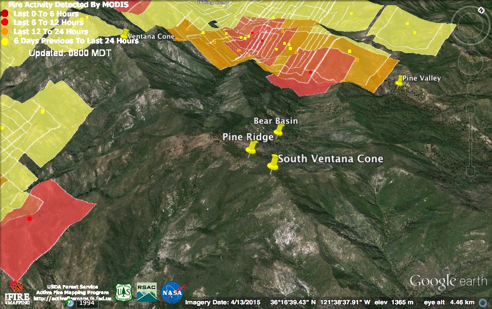 Today’s satellite passes were pretty close together (a little before 1:00 pm and a little after 2:00 pm) so they don’t provide as complete a picture of the day’s events as usual. What can be seen looks like more of the same. Active fire along Logwood Creek, fire from Lion Creek past Sykes to Redwood Creek, and fire east of the Carmel River from beneath Ventana Cone to Pine Valley. Active fire does appear to be encroaching on Pine Valley again. This time by burning up along the east bank of the river.