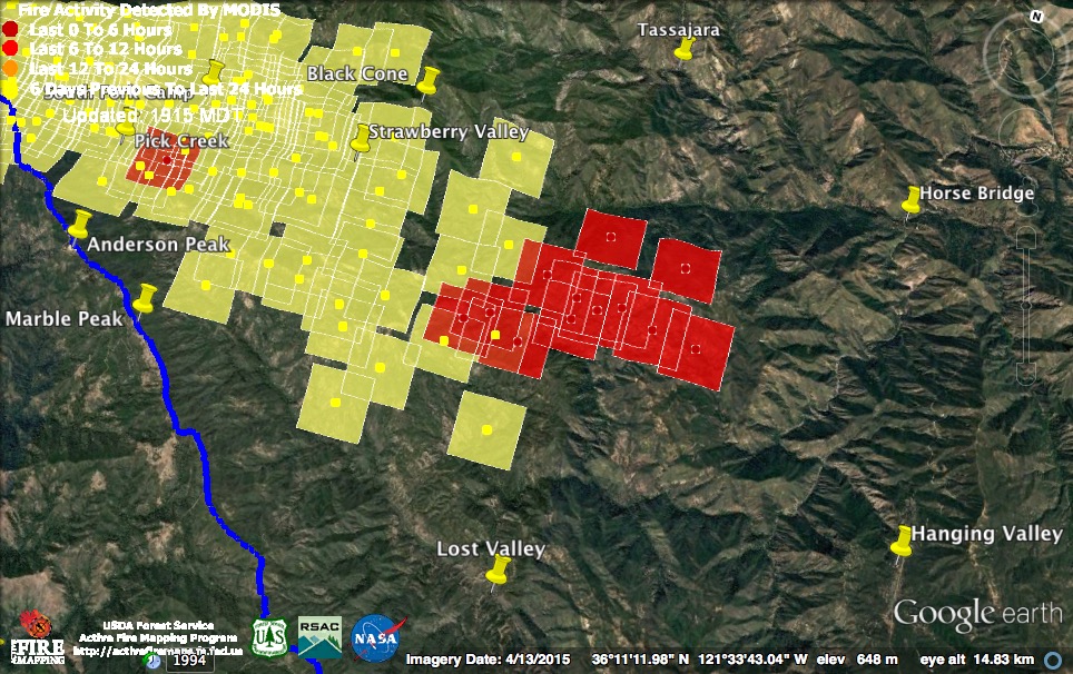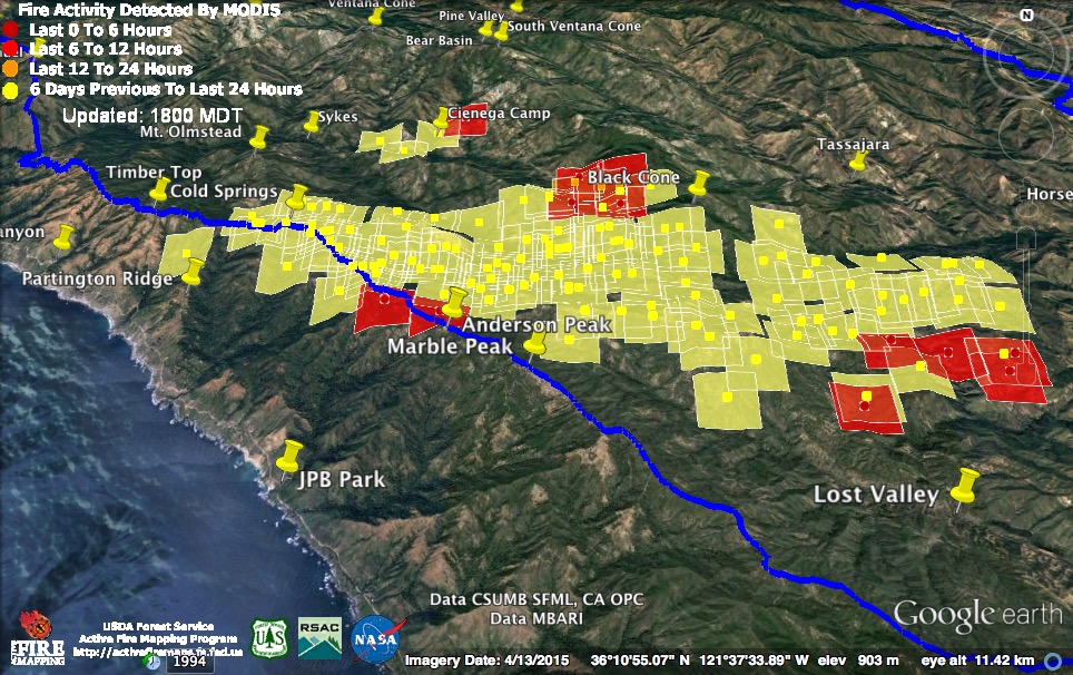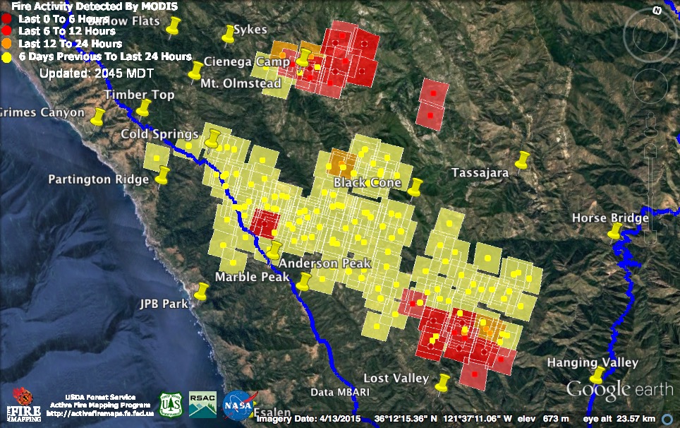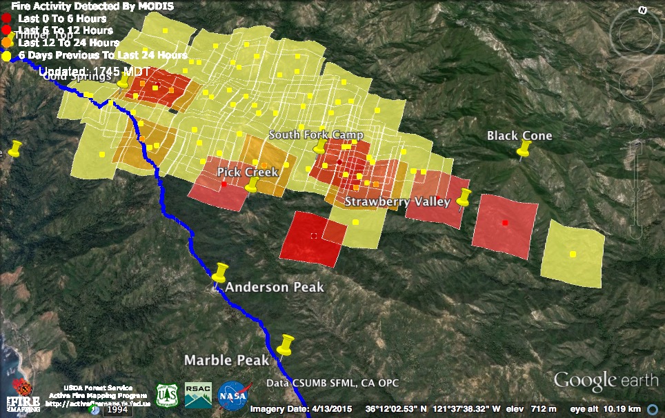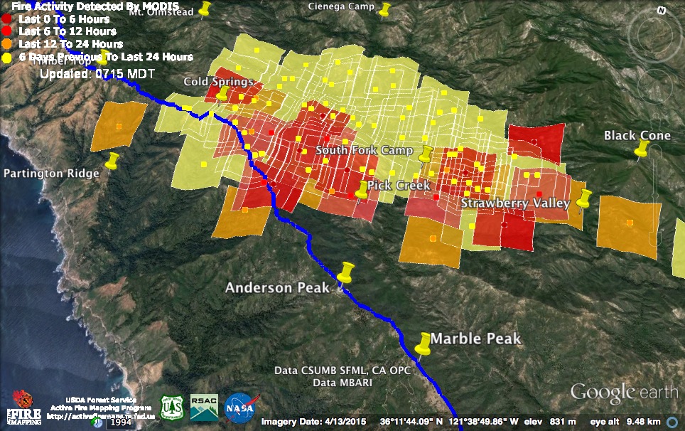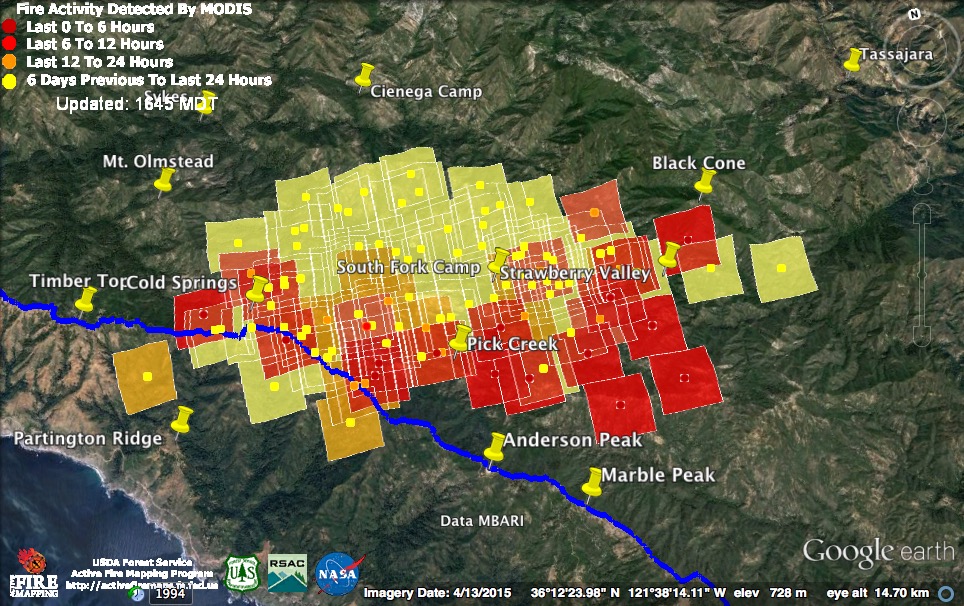 Just like the MODIS system itself, my confidence in the accuracy of those detections is zero. If there had been widespread fire in McWay Canyon yesterday afternoon we would have heard about it.