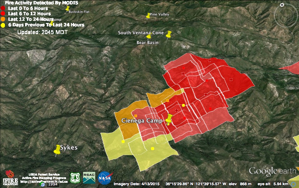 The 11:00 pm satellite found fire actively moving up both sides of Cienega Creek toward Pine Ridge and South Ventana Cone, as well as on the ridge between the forks of the Big Sur River, and overlooking Lost Valley Creek. The 3:30 am satellite found heat only at the south (Lost Valley Creek) end of the fire.