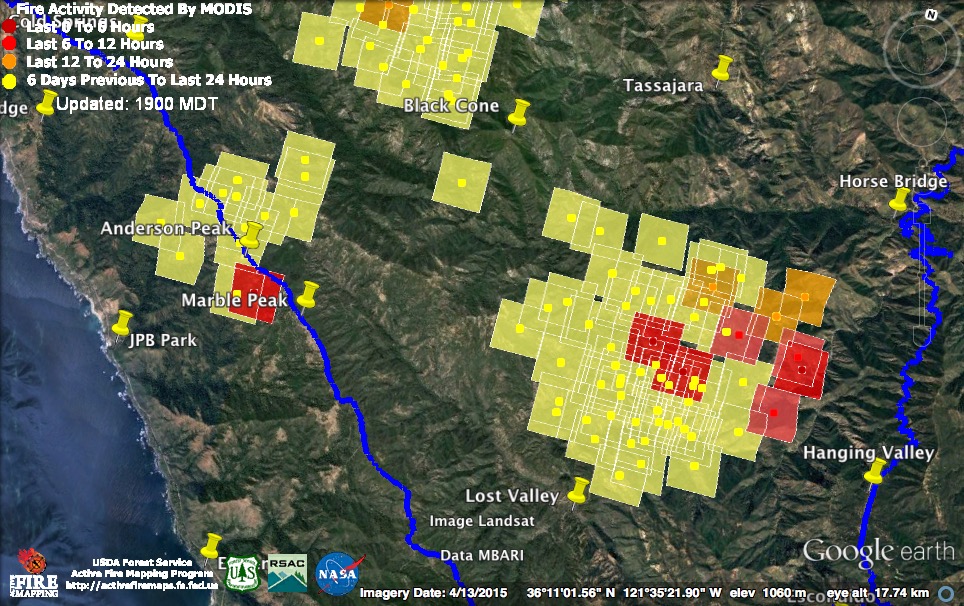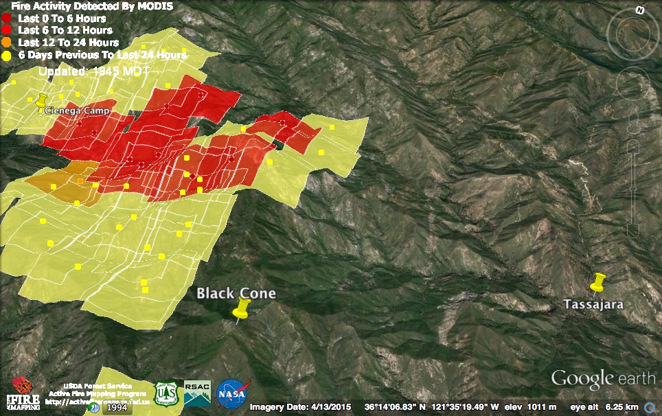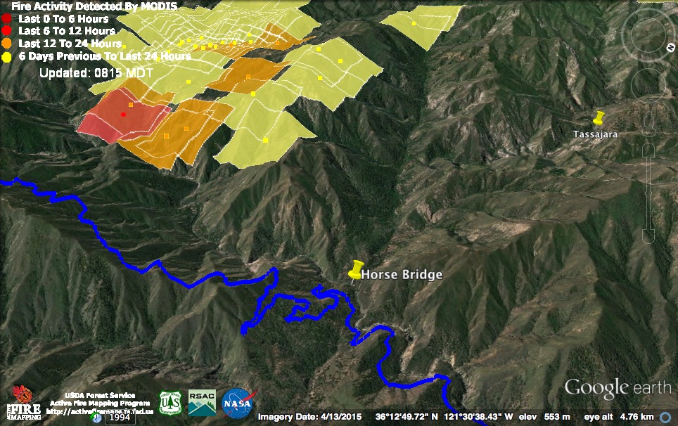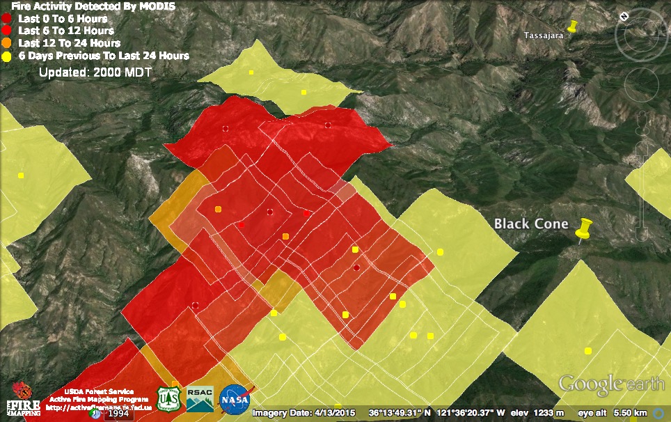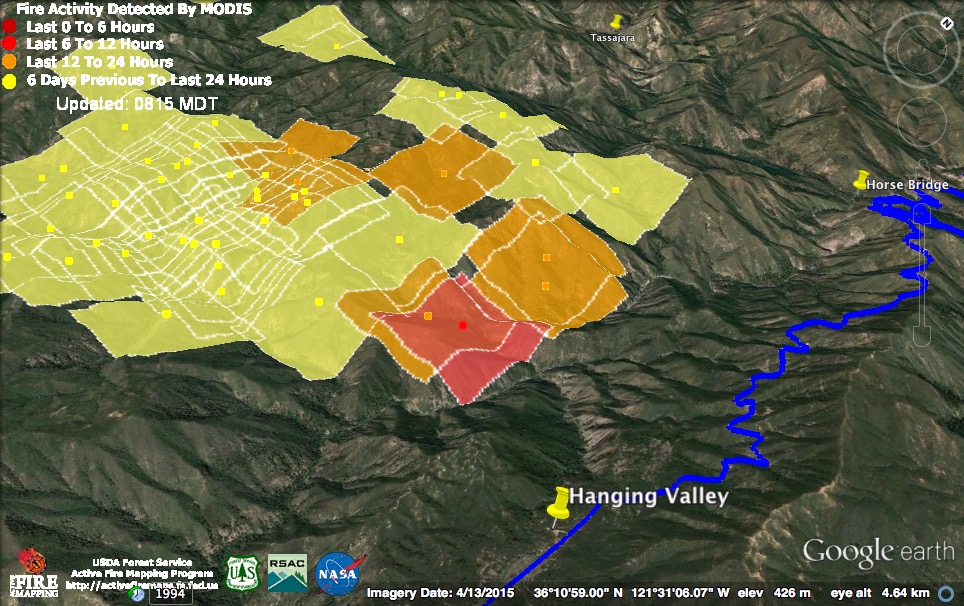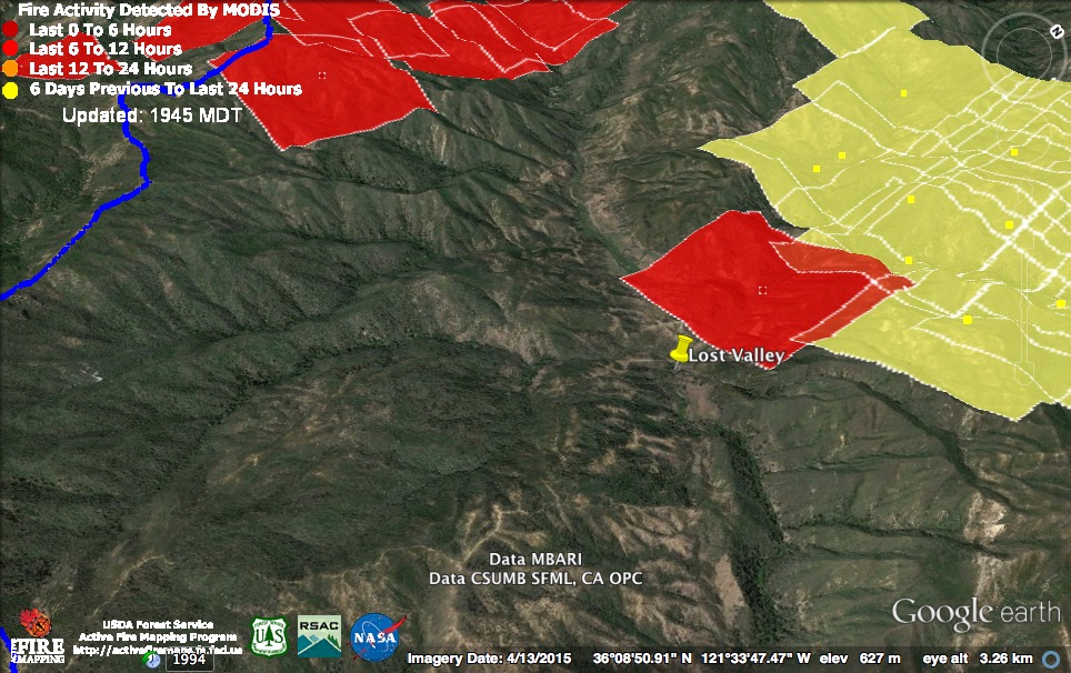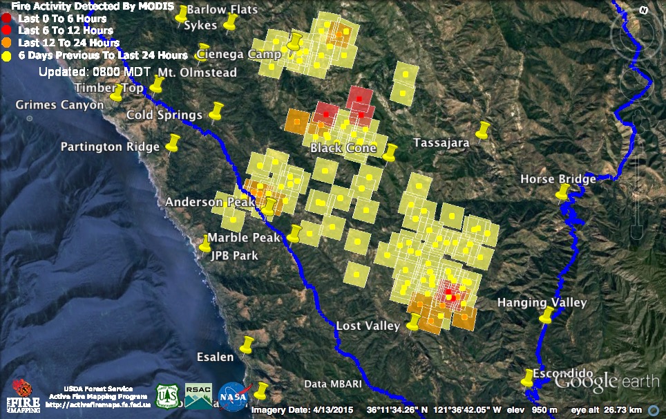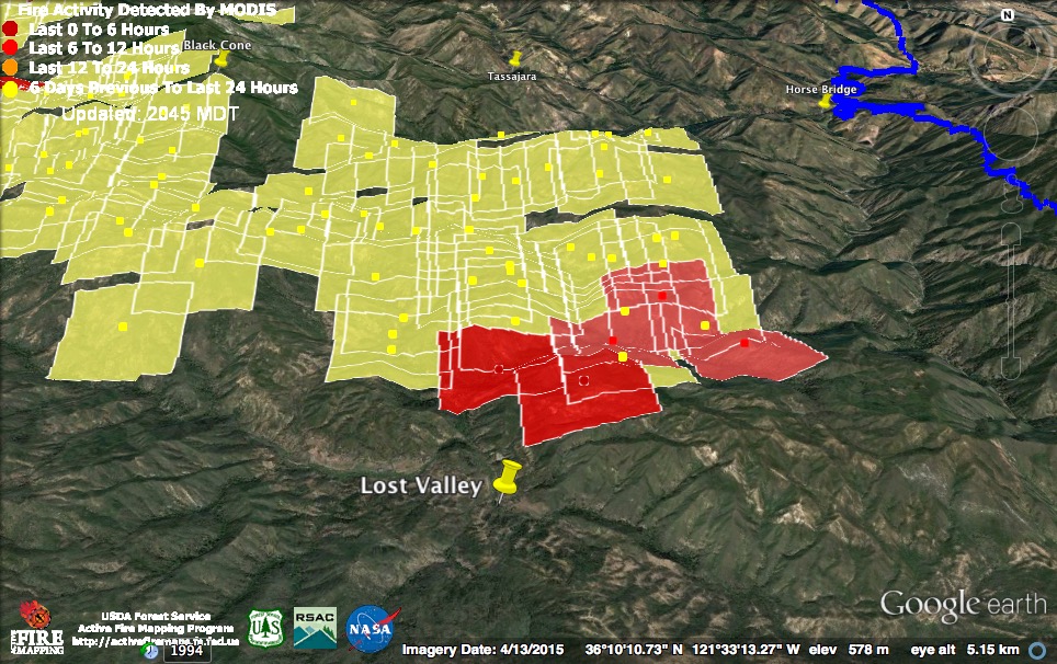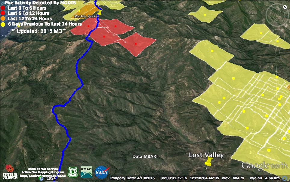 While it does not provide information on temperatures, etc. (which are, themselves, subject to a good deal of error), I prefer the MODIS data in these .kml files to more detailed formats because I think it provides, for most people, a clearer picture of the fire’s general location in relation to known landmarks. I also think a bunch of exact temperatures and confidence numbers create a false sense of accuracy and exactitude.