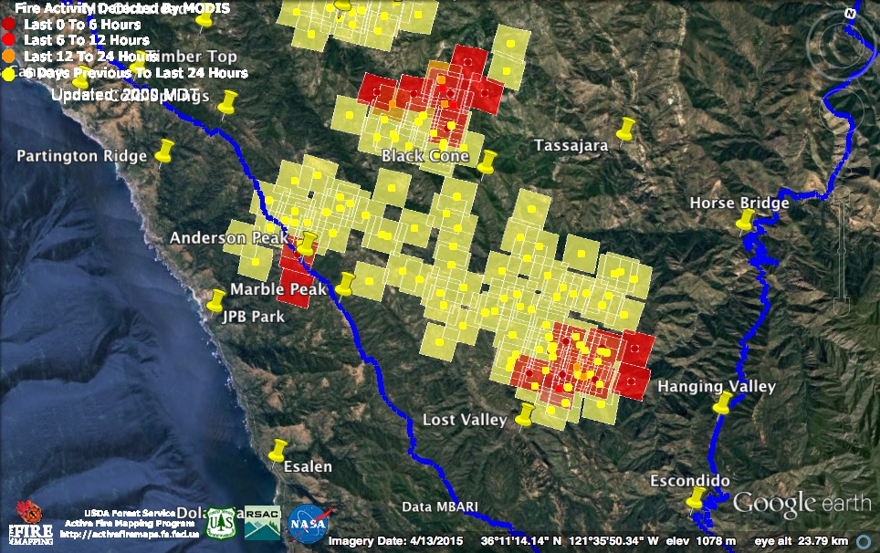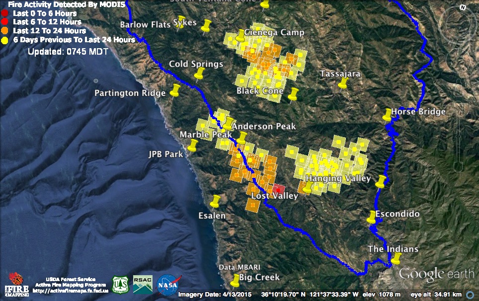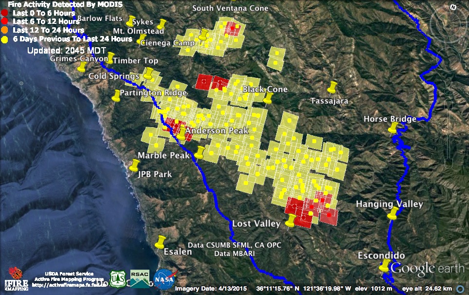 The fire made another big run out of the North Fork Big Sur River and up to the ridge overlooking Tassajara Creek today. There was a report a little over an hour after these heat detections were acquired that Incident Command was requesting 3 additional air tankers (for a total of 7) due to the fire making a “heavy” run and spotting up to a quarter mile ahead. Whether or not they succeeded (once again) in preventing fire from establishing itself in the Tassajara drainage we probably won’t know until tomorrow.