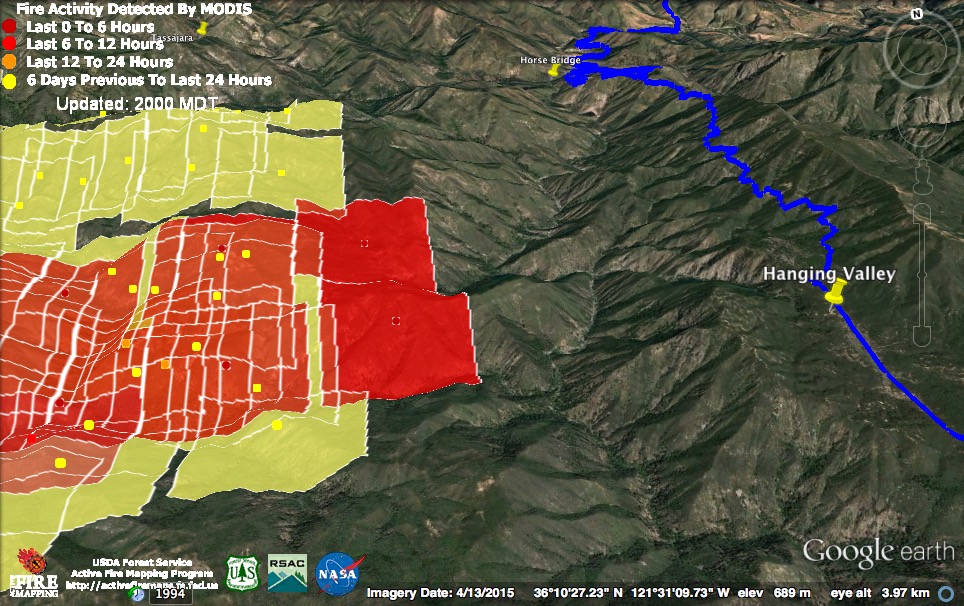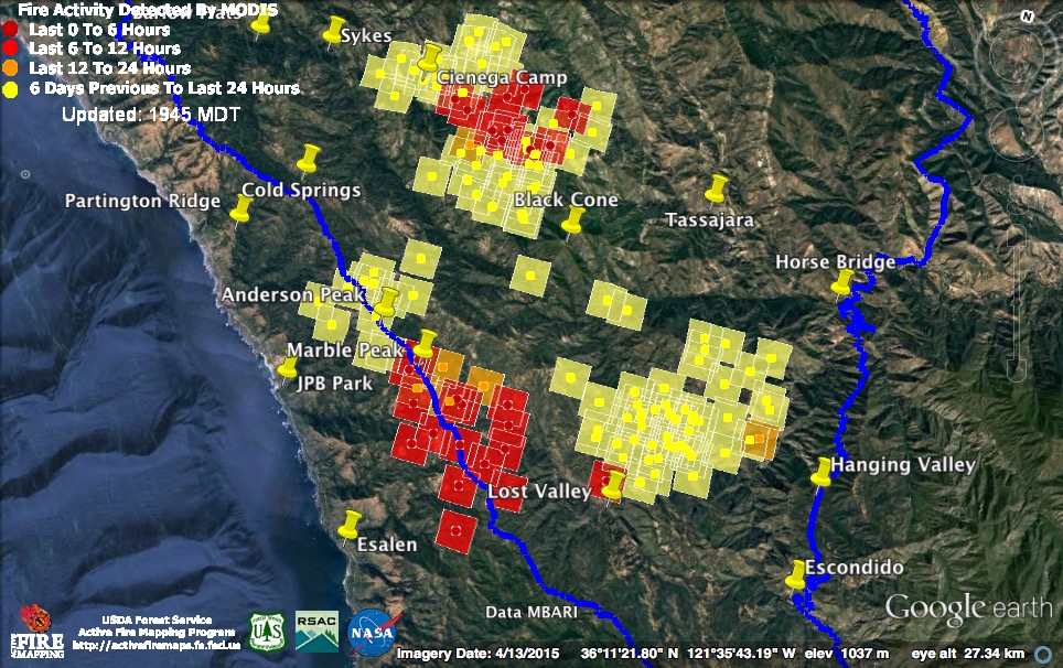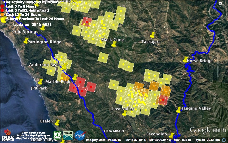 Satellite passes at around 10:30 pm and 3:00 am found fire moving downstream along the North Fork Big Sur River, backing toward the Arroyo Seco River and spreading east from firing operations on the Coast Ridge.