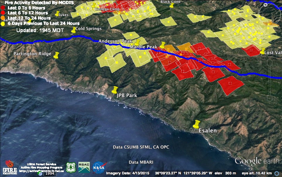 Firing operations continued southeast along the Coast Ridge between Anderson Peak and Marble Peak today. Meanwhile, the main fire remained very active along the North Fork Big Sur River and along Lost Valley Creek. Light red heat detections were acquired around 12:30 pm; dark red around 2:00 pm.