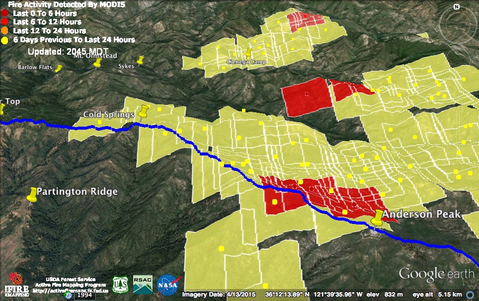 Today’s MODIS data, for example, does not convince me that the fire has jumped the Coast Ridge line (even though at least one of the detections outside the line has a confidence level of better than 80%). This is because I have not heard any reports suggesting a breach of the line in this area.
