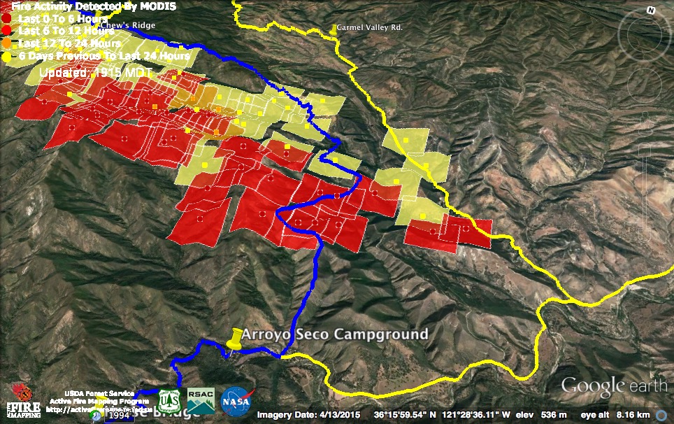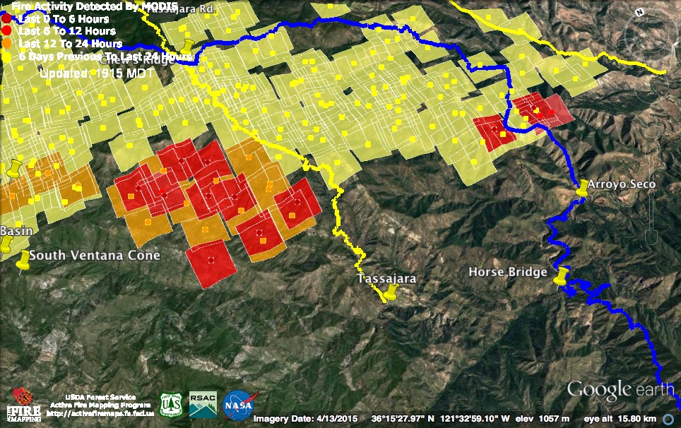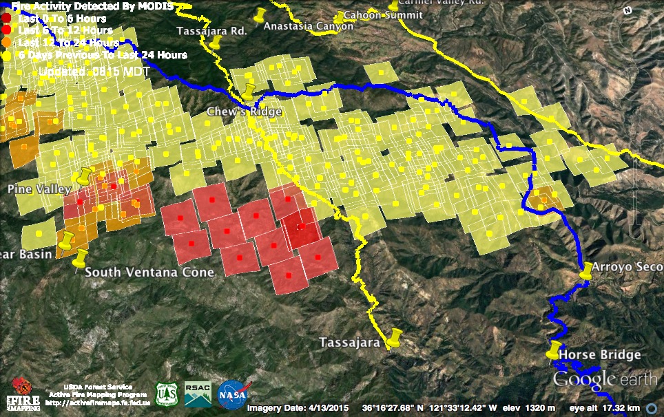 The red squares on the map were acquired at around 12:30 pm and 2:00 pm today. The blue line is the primary containment line (there are multiple contingency lines in the area where fire appears to be spilling over today). The yellow lines are the Tassajara, Carmel Valley and Arroyo Seco roads.