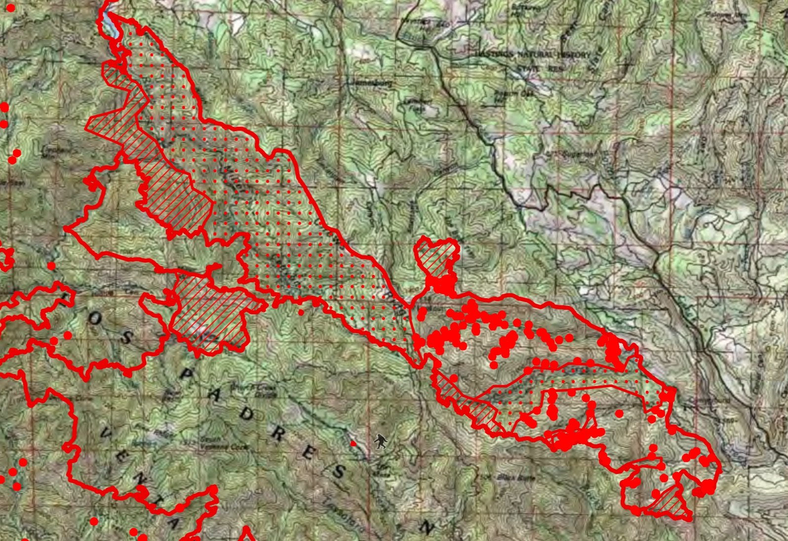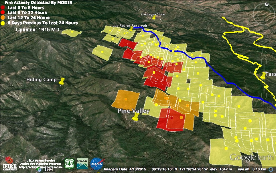 The light red squares were acquired around 11:30 pm last night; the dark red squares around 3:30 am this morning. I apologize for having omitted the containment line between the Chews Ridge Summit and the Los Padres Reservoir.