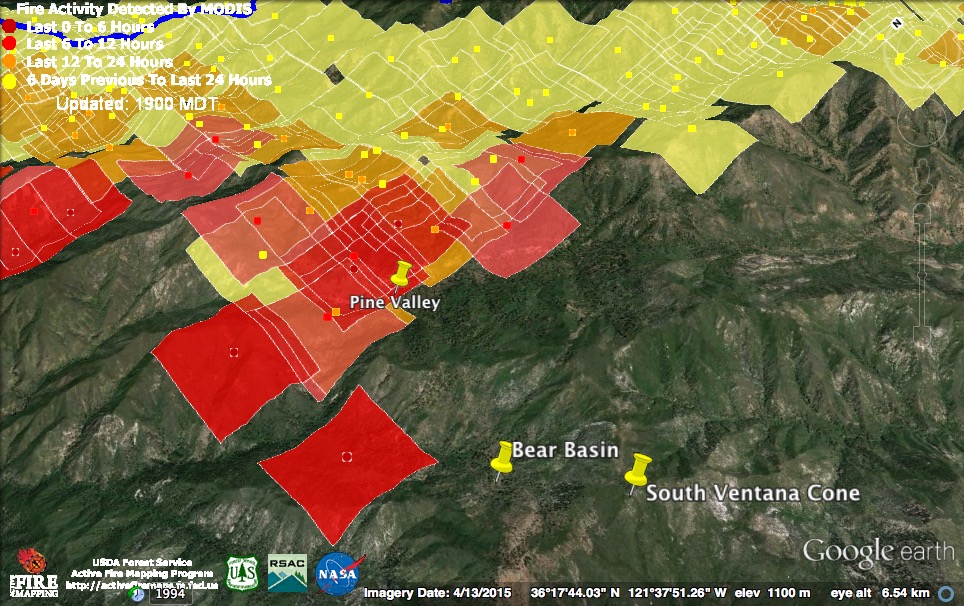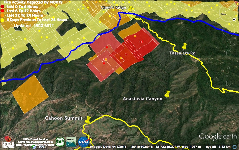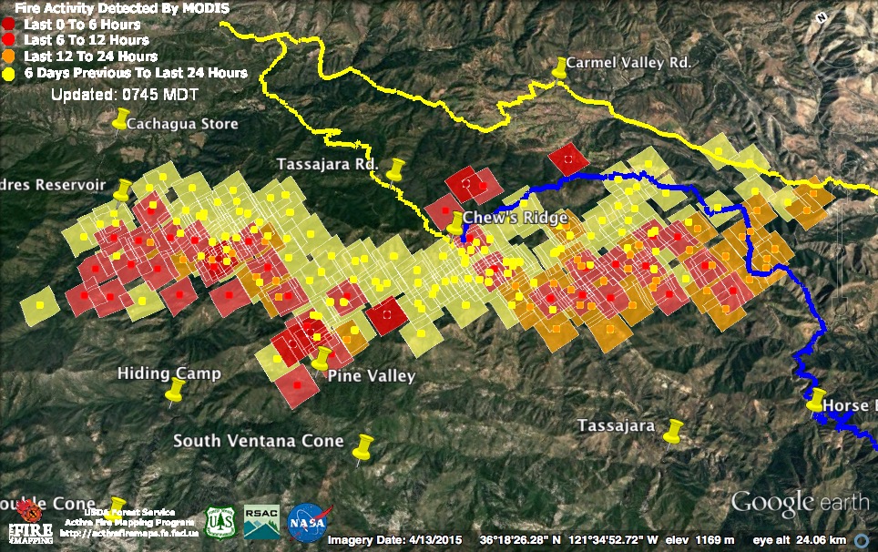 The fire hadn’t really gotten cranking when the 11:00 am MODIS satellite passed over. It found heat in only one spot (the light red square) in the, probably inconsequential, slop over at the fire’s eastern edge. The 2:30 pm pass was a different story, though, finding a lot of active fire (the dark red squares) throughout the Church Creek drainage. The good news is that there was no sign of fire have progressed further toward the Tassjara Zen Center. No new heat detections from the slop over on top of Chews Ridge is also good news.