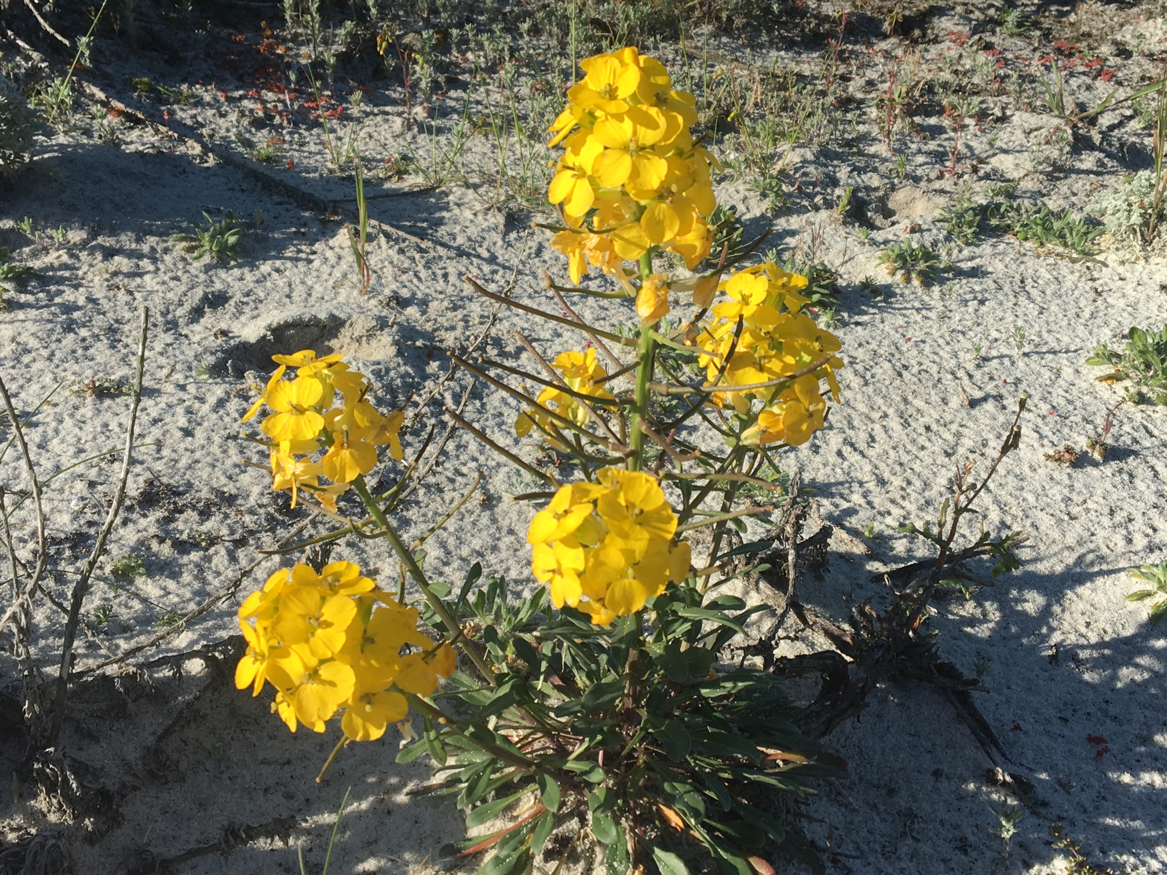 Federally listed endangered species Menzies’ Wallflower (Erysimum menziesii), does not occur south of Cypress Point on the Monterey Peninsula. Already a rarity when the first Europeans arrived in California, dune development has placed this plant’s continued existence in extreme jeopardy.