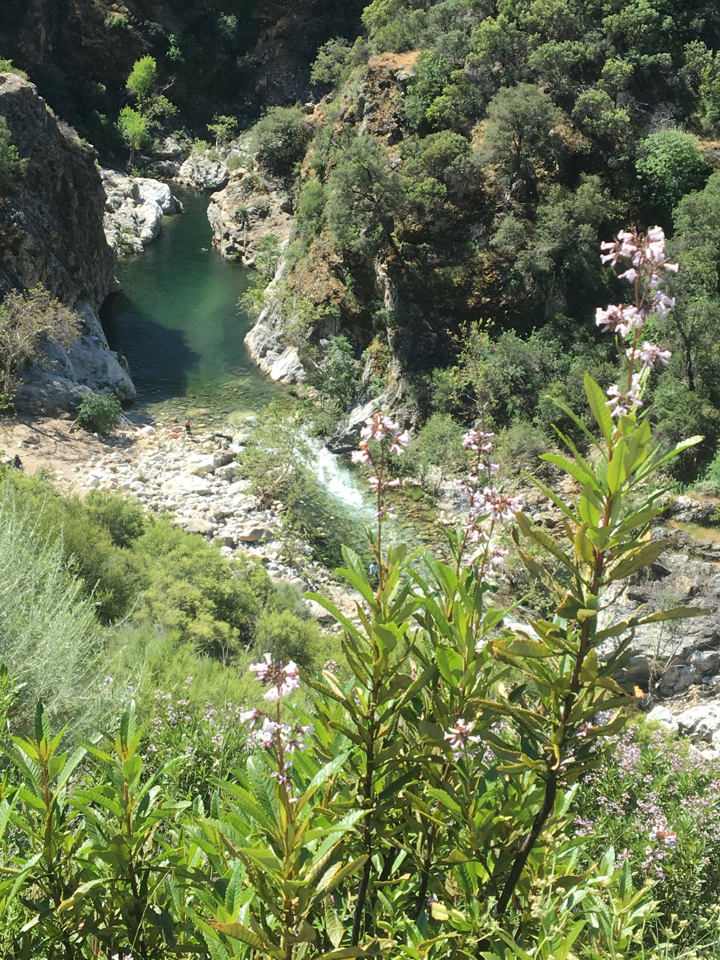 This is the time to go, as the wildflowers are at their peak (all photos from April 28, 2019). This is yerba santa (Eriodictyon californium) blooming above one of the Arroyo Seco River’s most popular swimming holes. The swimming holes near the Arroyo Seco end of the road are very popular with locals from the Salinas Valley. The Indians, on the other hand, might as well be a Santa Cruz City Park (not that there’s anything wrong with that). We saw nine or ten other people on bikes.